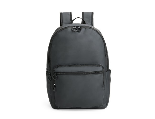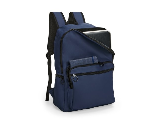 Mochila confeccionada em filme sintético tipo couro impermeável com fechamento em zíper e capacidade de até 23 litros. Apresenta compartimento interno com divisória para notebooks de até 15,3 polegadas. Possui três compartimentos externos em tamanhos variados, bolso lateral aberto e tecido respirável aplicado na área das costas e nas alças.