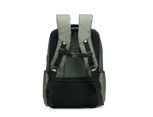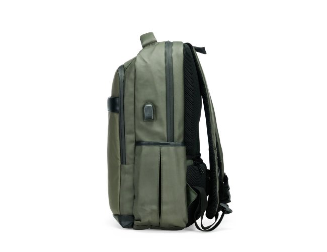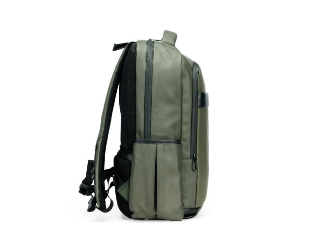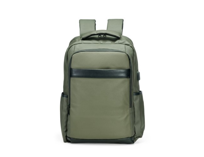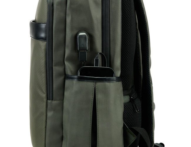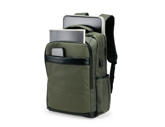 Mochila confeccionada em couro sintético impermeável, com fechamento em zíper e capacidade de até 21 litros. Conta com divisória interna para notebooks de até 15,3 polegadas e entrada para cabo USB. Possui cinco compartimentos externos, sendo um bolso frontal, outro com divisórias internas, dois bolsos laterais abertos e bolso antifurto traseiro. Dispõe ainda de alça de mão, duas alças para as costas com engate para malas de viagem e costas acolchoadas em tecido respirável. Acompanha placa metálica para personalização.