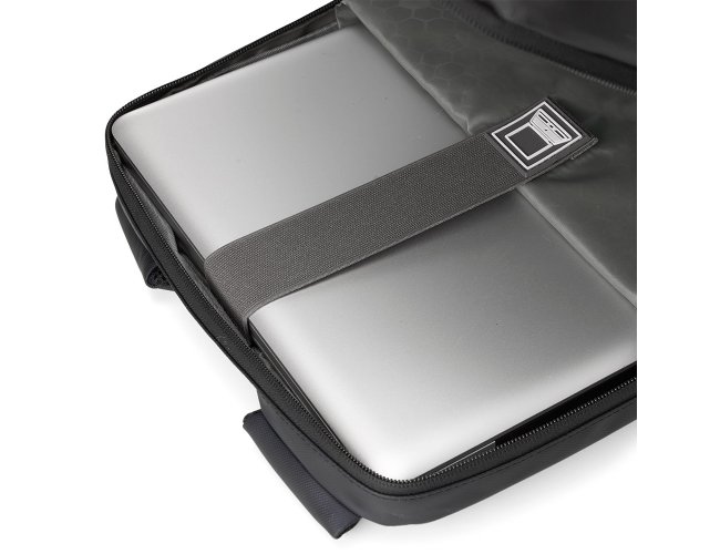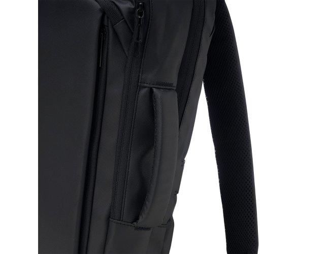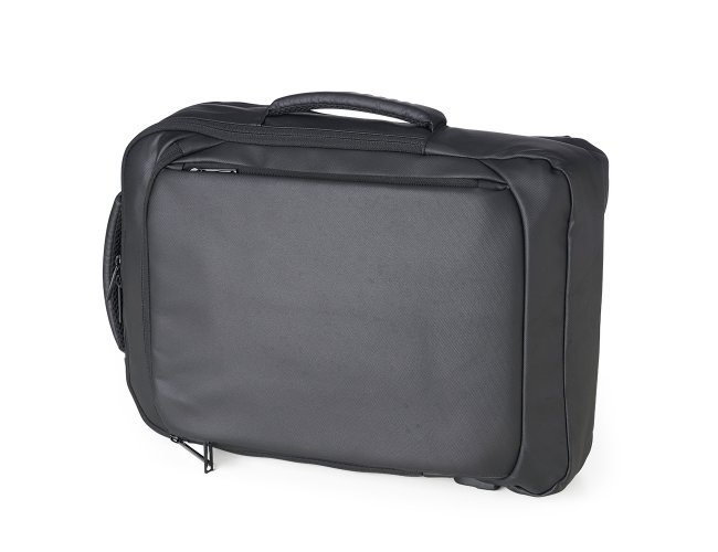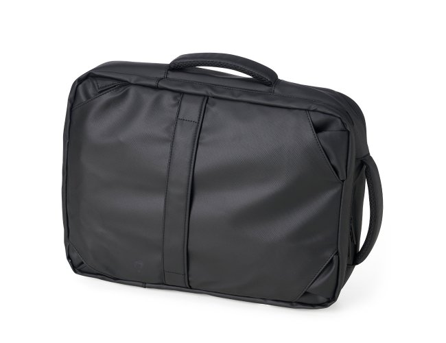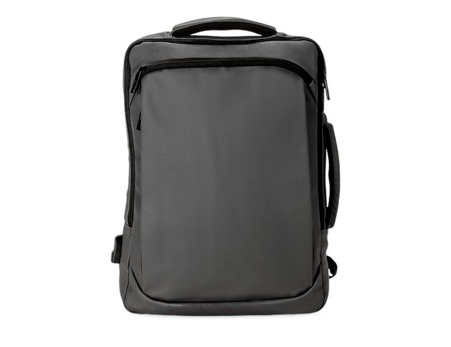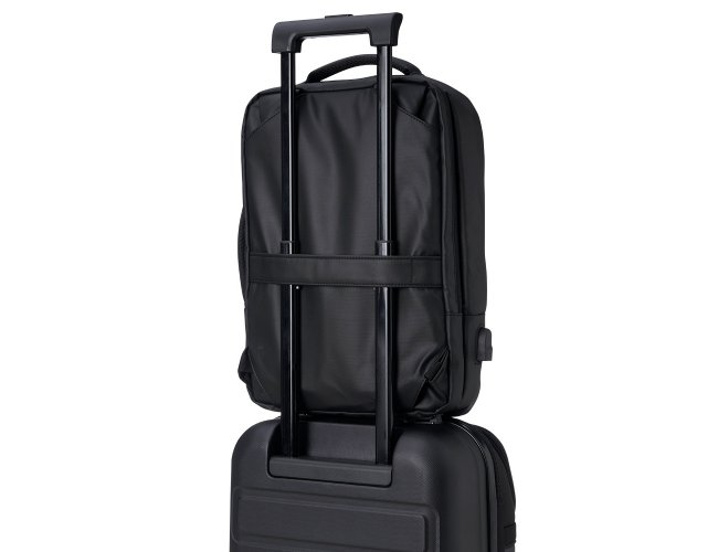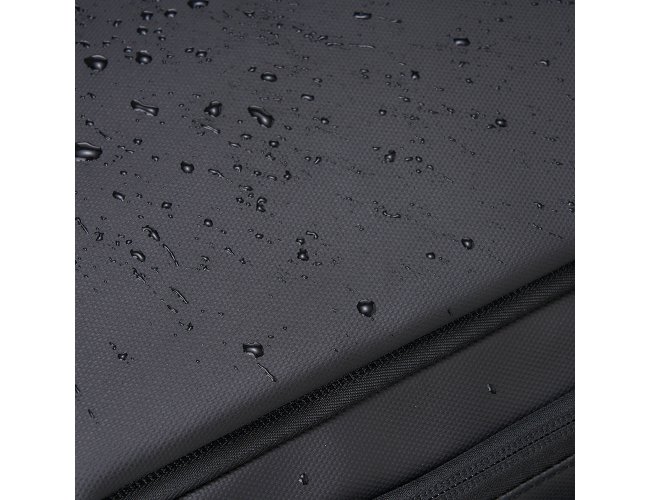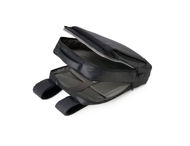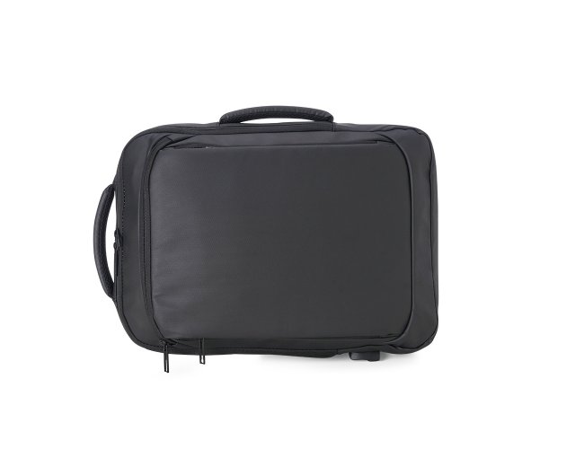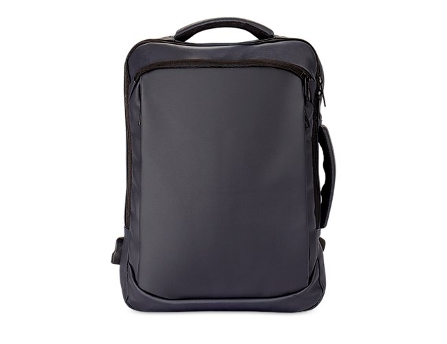 Mochila em couro sintético 22 litros resistente à água com cinco compartimentos, sendo o principal com bolso para notebook 15,6. Com divisórias internas para acessórios, a mochila possui suporte externo usb, alça para encaixe em malas de viagem e duas alças de mãos, sendo uma delas lateral para o transporte da mochila no modo pasta.