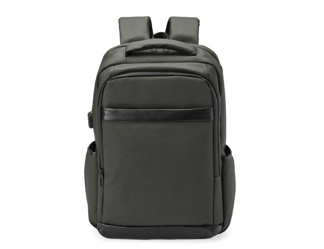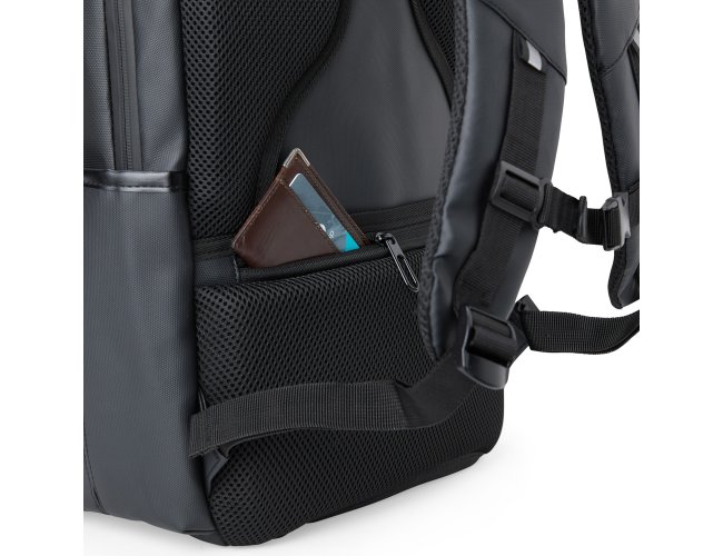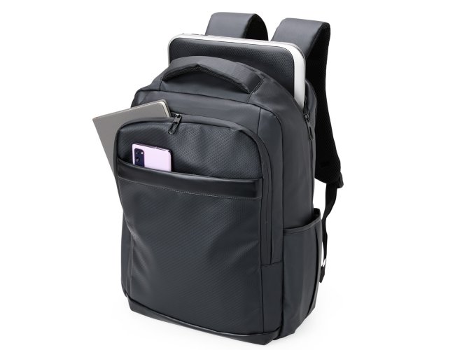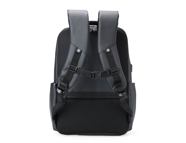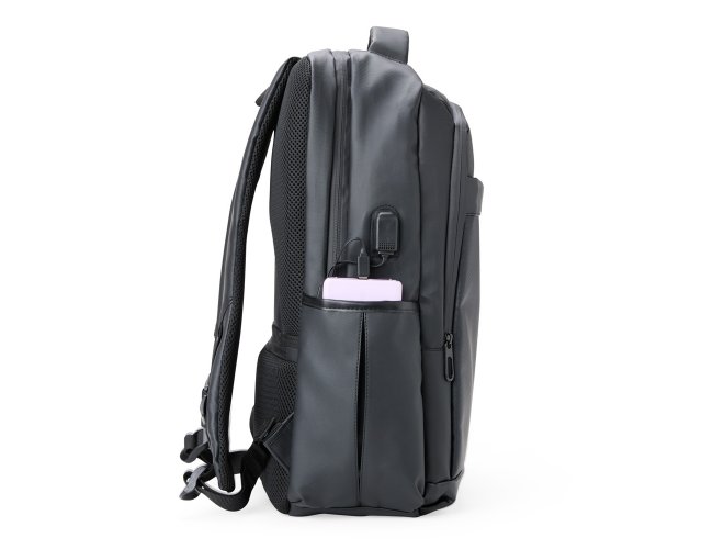 Nossa mochila de 26 litros combina funcionalidade e conforto! Feita em couro sintético resistente à água e com design inteligente, é perfeita para impressionar no mundo corporativo. Conta com quatro compartimentos estratégicos: um frontal, outro com bolsos e divisórias para documentos e canetas, um compartimento antifurto para proteger os itens mais valiosos e um principal, com espaço para notebooks de até 15,6" e entrada para cabo USB. Além disso, possui plaquinha para personalização exclusiva, dois bolsos laterais, alças reguláveis e acolchoadas que distribuem o peso de forma equilibrada, acabamentos refletivos e uma parte traseira acolchoada, garantindo mais conforto. Para completar, conta com engate para malas de viagem, sendo a parceira ideal além do dia a dia do trabalho. Acompanha plaquinha metálica personalizável.