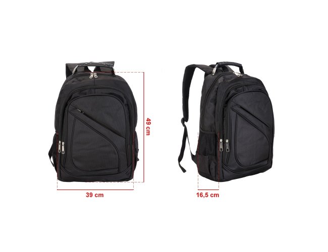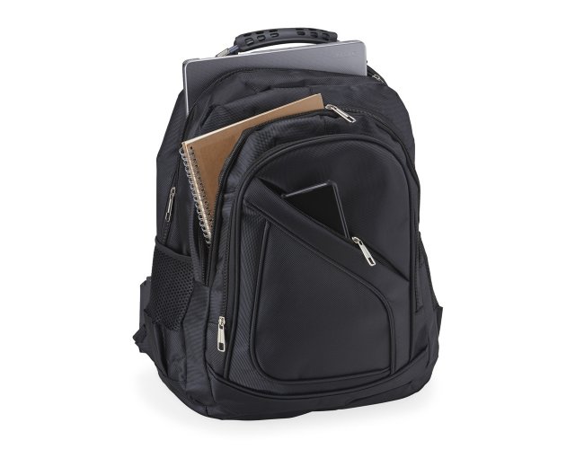Mochila de nylon 30 litros com quatro compartimentos, sendo o principal com bolso para notebook 15,6. A mochila possui bolsos laterais em malha, duas alças de mãos e área costada com revestimento espumado.