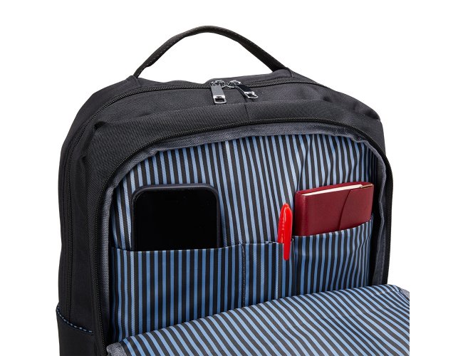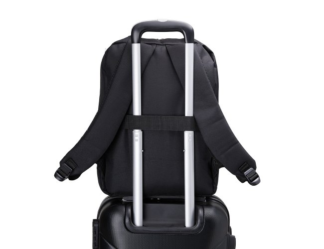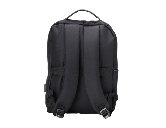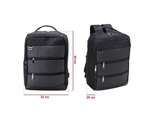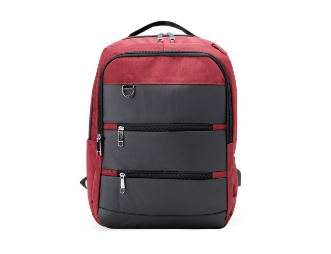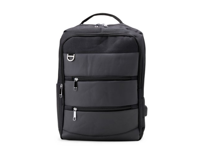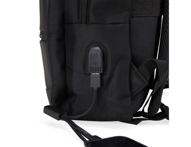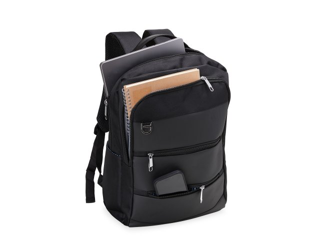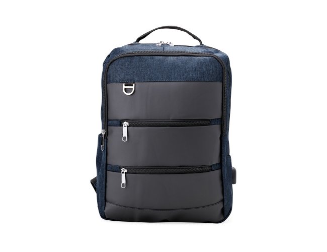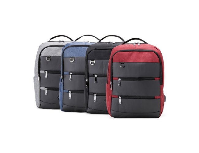 Mochila de nylon 23 Litros com detalhes em couro sintético e quatro compartimentos, sendo o principal com bolso para notebook 15,6. Com divisórias internas para acessórios, a mochila possui bolso lateral, suporte externo USB e alça para engate em malas de viagem.