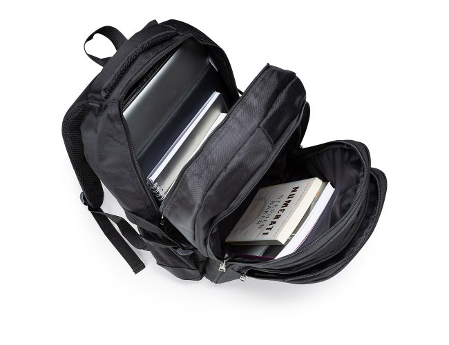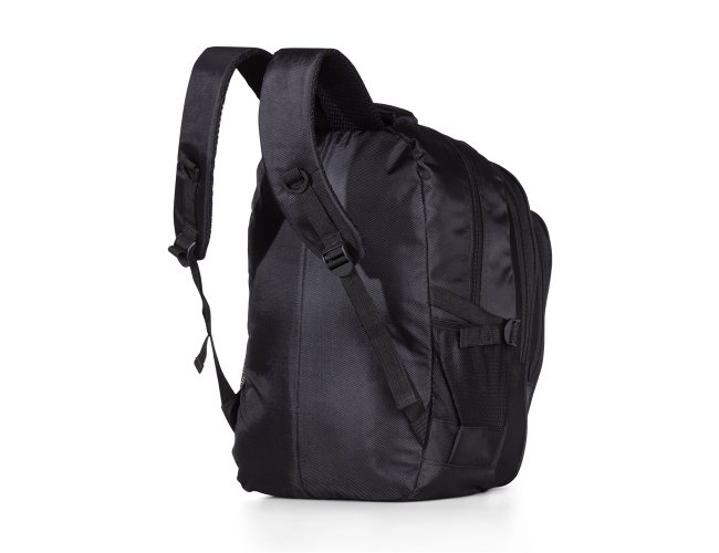 Mochila de nylon 27 litros com quatro compartimentos, sendo o principal com bolso para notebook 15,6. A mochila possui bolsos laterais em malha, alça de compensação e duas alças de mãos.