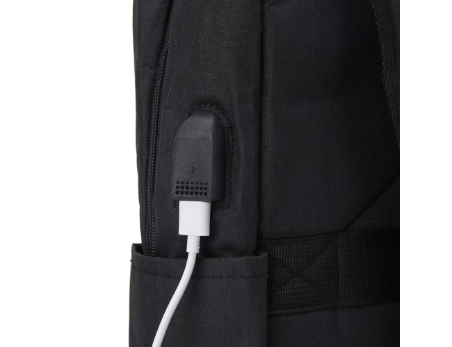 Mochila de nylon 20 litros com três compartimentos, sendo o principal com bolso para notebook 15,6. Com bolsos laterais e faixa frontal refletiva, a mochila possui adaptador USB externo, alça para encaixe em malas de viagem, duas alças de mãos e alças para as costas com revestimento espumado. Acompanha plaquinha metálica.