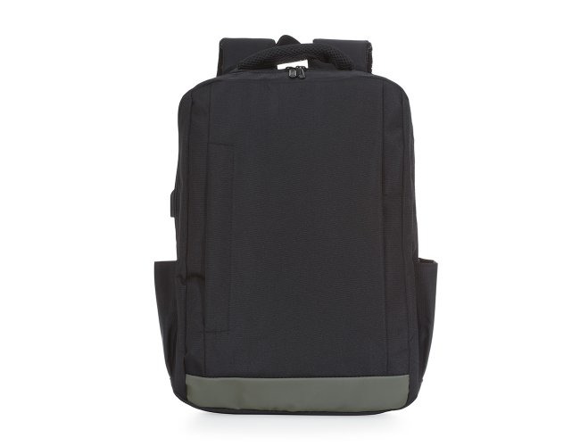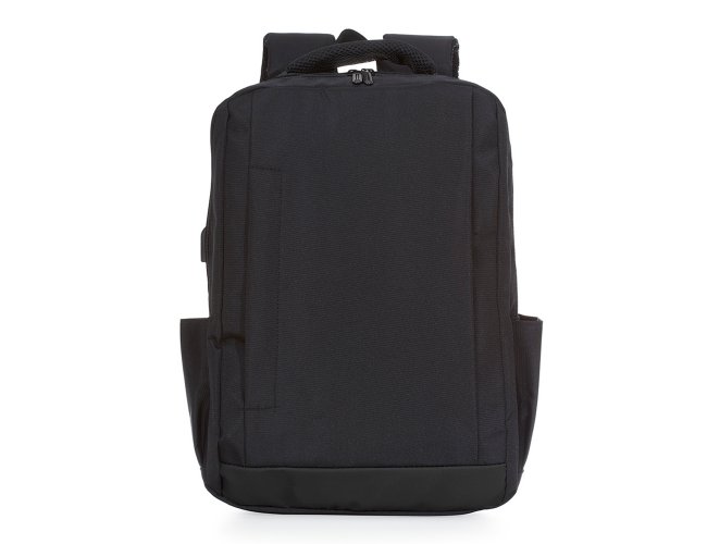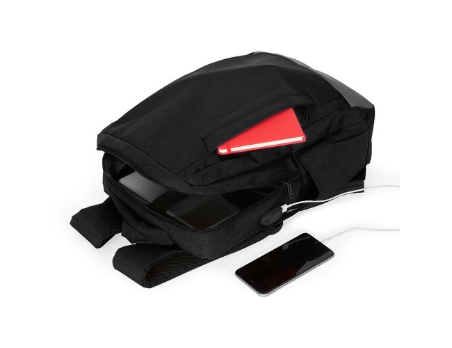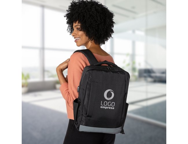 Mochila de nylon 21 litros com dois compartimentos, sendo o principal com bolso para notebook 15,6. Com divisórias internas para acessórios, a mochila possui bolsos laterais, suporte externo usb, duas alças de mãos e alça para engate em malas de viagem.