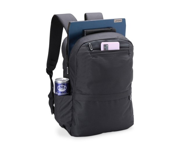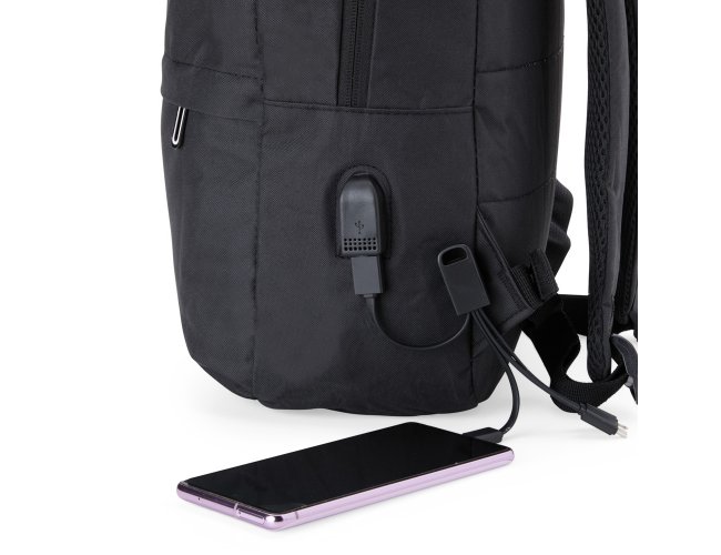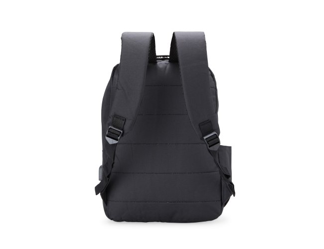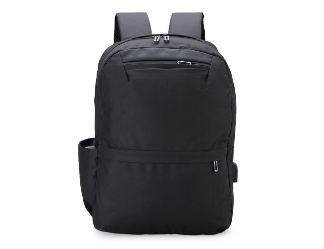 Mochila de nylon 24 litros com três compartimentos, sendo o principal com bolso para notebook 14 polegadas. A mochila possui um bolso lateral e suporte externo usb.