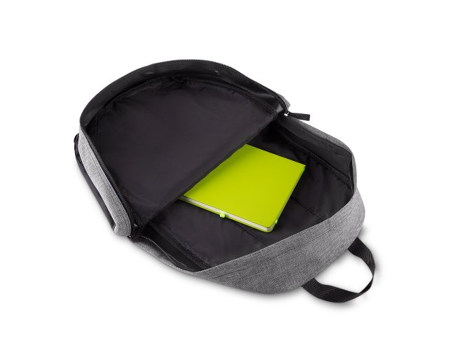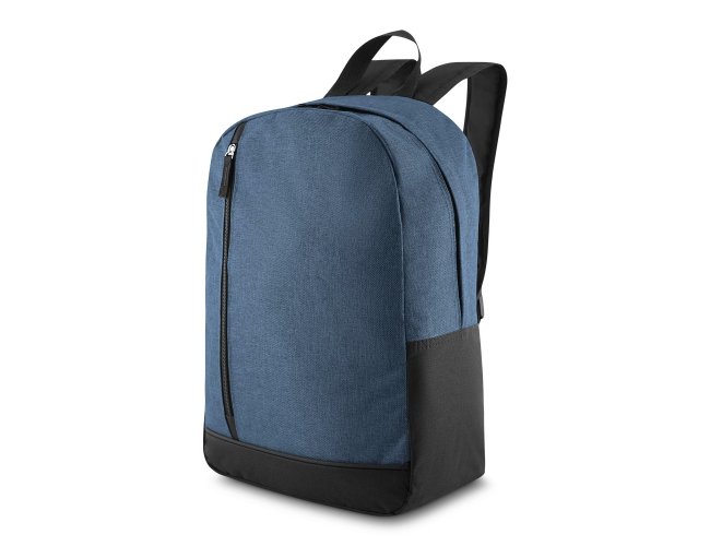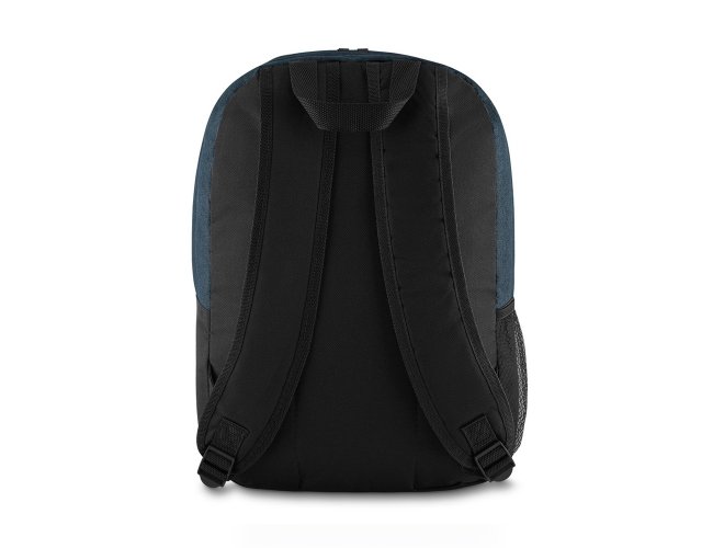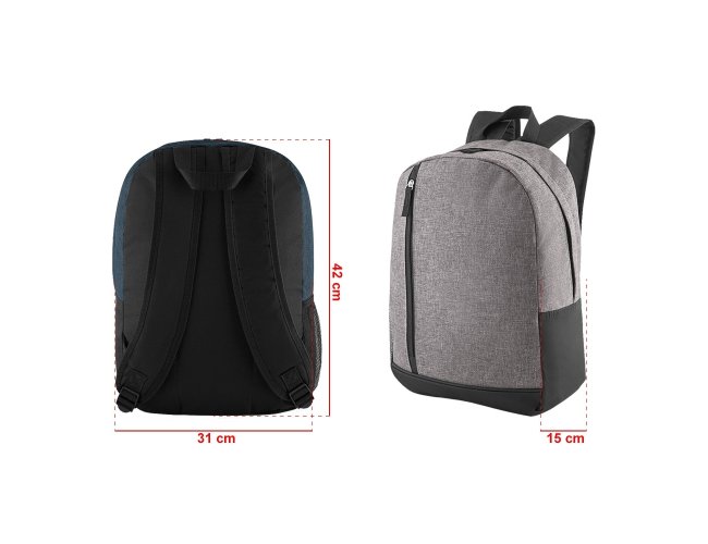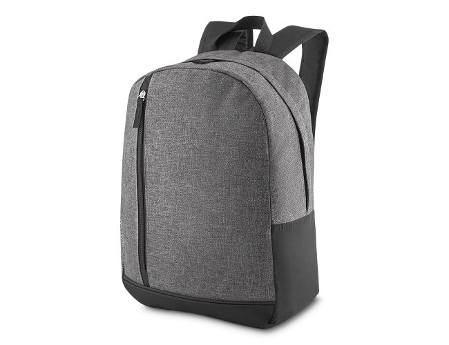 Mochila de poliéster com compartimento principal superior e compartimento frontal com abertura lateral. Contém um bolso de nylon na lateral, alça de mão em nylon e alças ajustáveis para as costas.