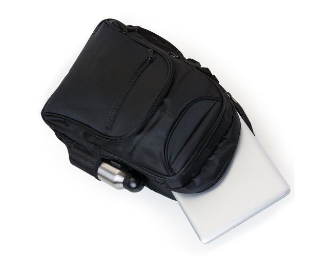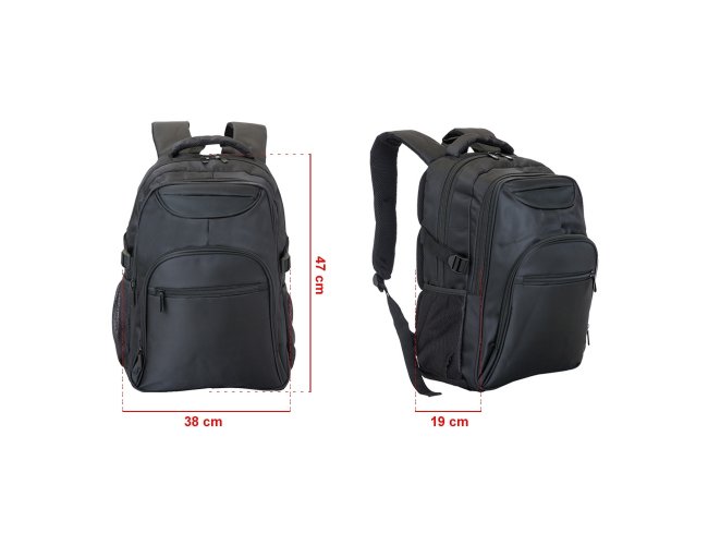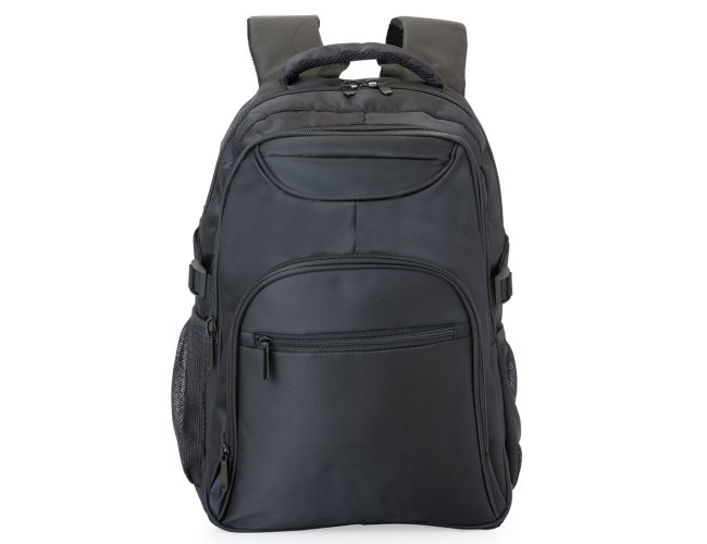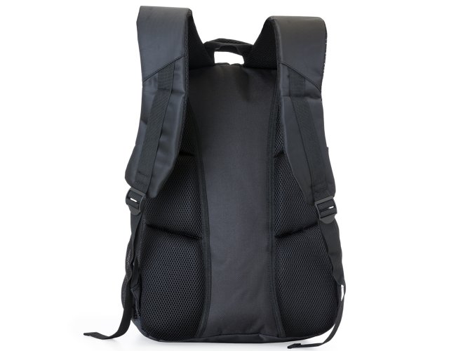 Mochila poliéster para notebook, contém detalhes em nylon e neoprene, compartimento grande com bolso interno, compartimento médio com bolso/suporte para documentos e divisórias para 3 canetas, mini bolso com frontal superior, compartimento pequeno com bolso frontal e dois bolsos laterais de tela(nylon). Zíperes preto, duas fivelas laterais que podem ser encaixadas nas alças laterais para fechar com mais segurança a mochila, alça superior acolchoada e alça de nylon, alças ajustáveis para as costas revestidas com espuma e parte traseira também revestida de espuma para um maior conforto.