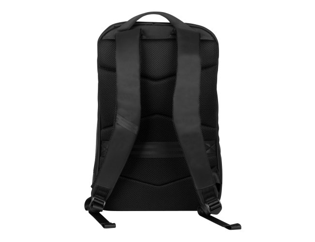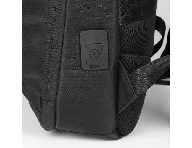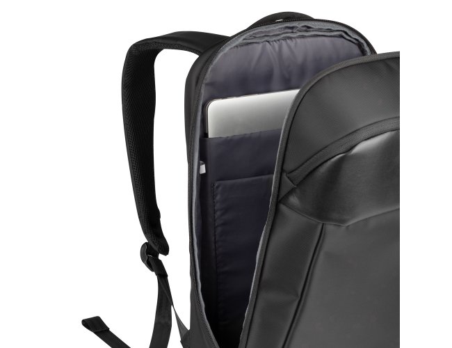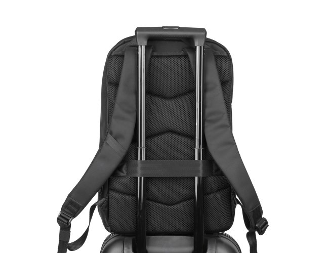 Mochila de 23 litros premium em poliéster impermeável com dois compartimentos, sendo um deles para notebook 15,6 e tablet 10,5. Com divisórias internas para documentos, a mochila possui adaptador USB externo, área costada e alças para as costas com revestimento espumado e alça de engate paa malas de viagem.