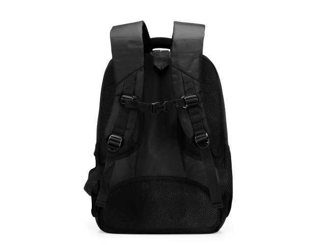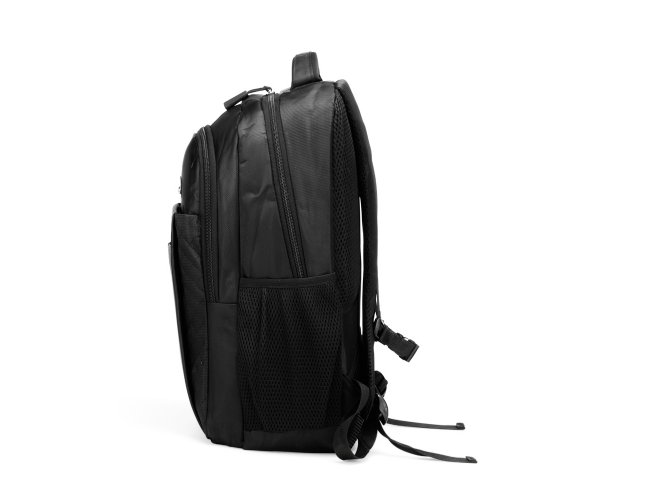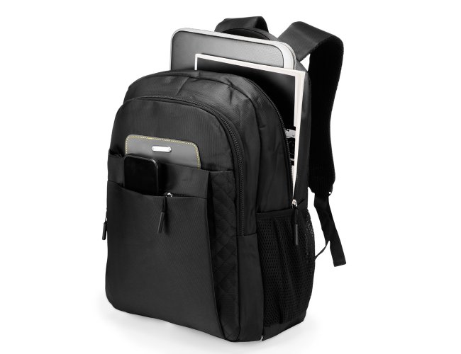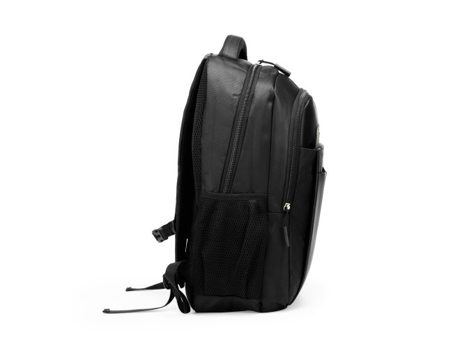 Mochila confeccionada em Jacquard 260 g/m² resistente à água, com detalhes em metal e couro sintético, fechamento em zíper com puxadores plásticos e capacidade de até 22 litros. Apresenta compartimento interno com divisória para notebooks de até 15,3 polegadas. Possui quatro compartimentos externos: dois bolsos frontais, um deles com divisórias internas e dois laterais abertos em tela de nylon. Dispõe ainda de alça de mão, duas alças de costas com engate para malas de viagem e costas acolchoadas em tecido respirável.