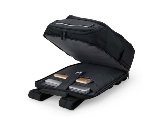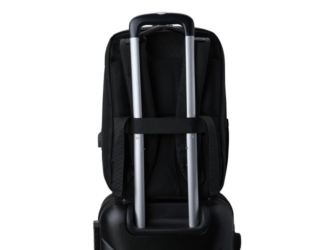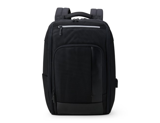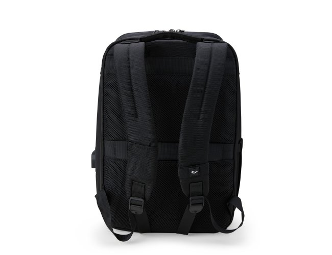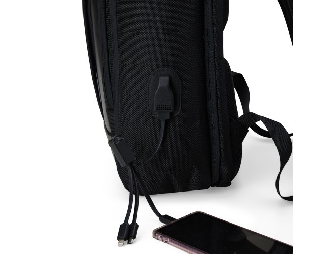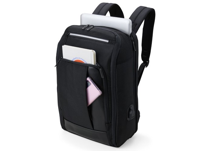 Mochila confeccionada em Nylon 22 litros com detalhes em couro sintético. Contém 5 compartimentos, sendo um bolso com faixa refletiva, divisórias internas para acessórios, bolso para tablet e notebook 15.6, bolso antifurto nas costas, bolso externo na lateral com elástico, suporte externo USB, alça para encaixe em malas de viagem, alças da mochila possuem bolsos integrados para suporte de óculos e cartões.