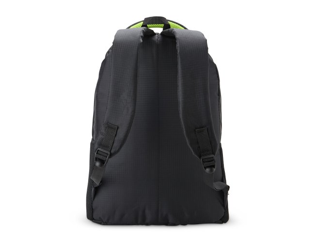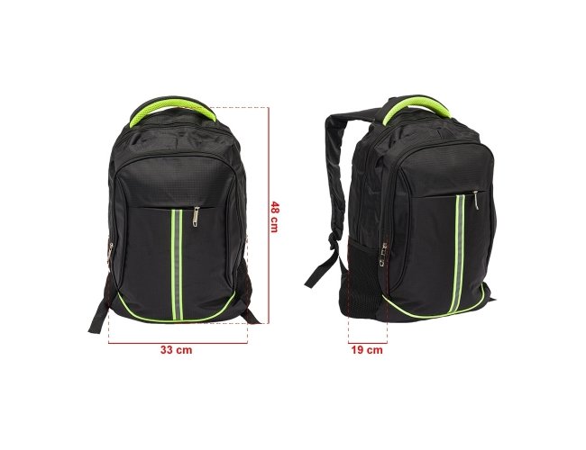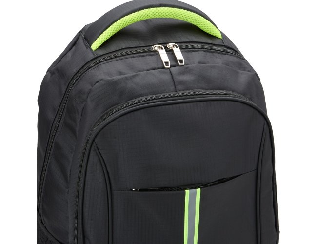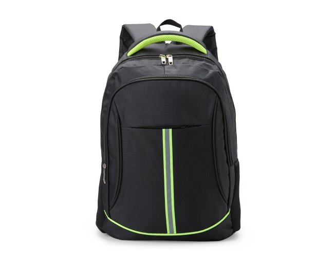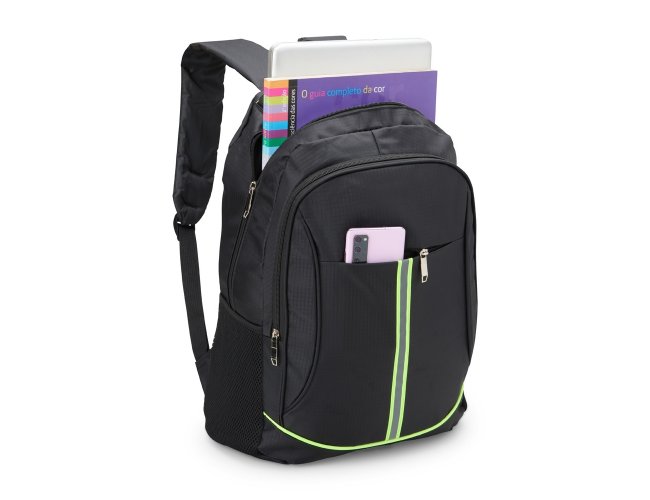 Mochila de nylon 26 Litros com três compartimentos, sendo o principal com bolso para notebook de 15,6. A mochila possui bolsos laterais em malha e faixa reflexiva na parte frontal.