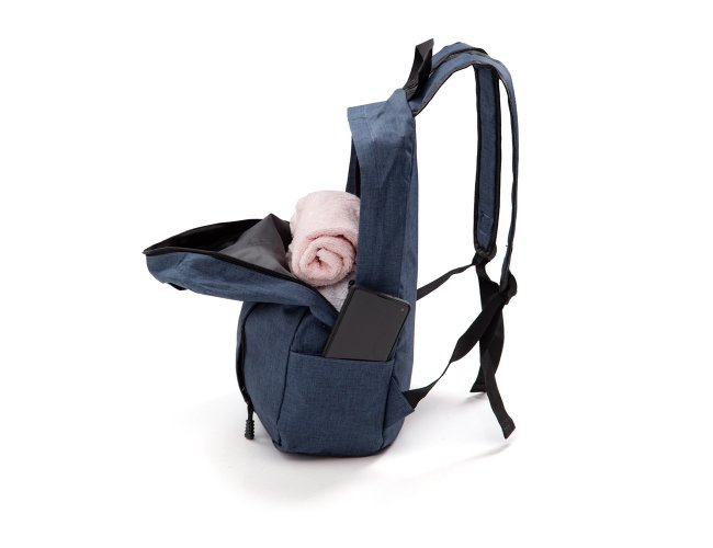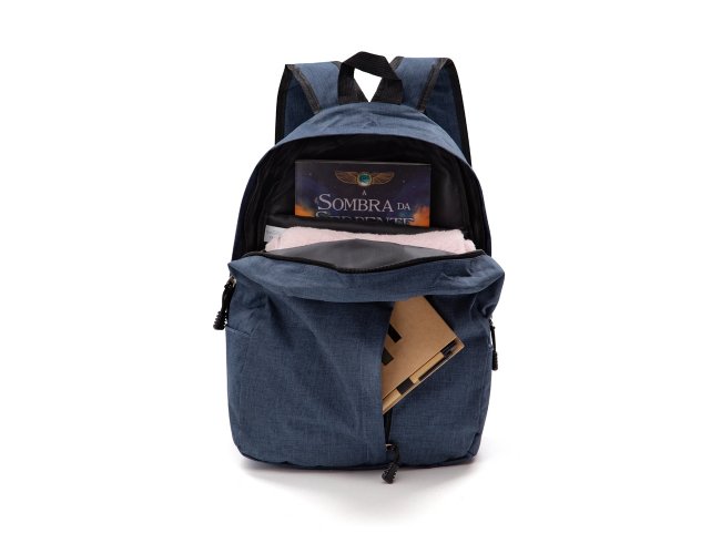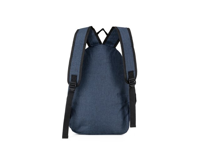 Mochila em poliéster com compartimento para notebook até 14 polegadas. Contém um compartimento grande, compartimento frontal e bolsos laterais. Alça de mão em nylon e alças para as costas ajustáveis.