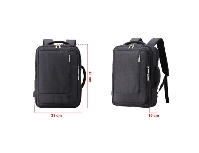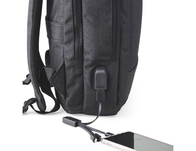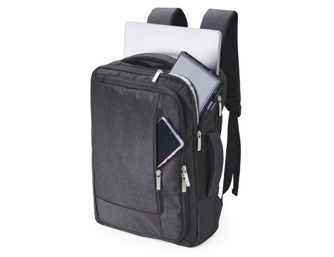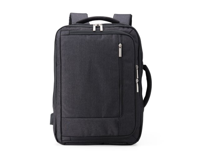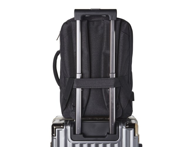 Mochila de poliéster 21 litros com 4 compartimentos, sendo o principal com bolso para notebook 15,6 e compartimento com bolso sanfonado, ideal para documentos. Com divisórias internas para acessórios, a mochila possui suporte externo USB, alça para engate em malas de viagem e duas alças de mãos, sendo uma delas para o transporte da mochila no formato pasta.