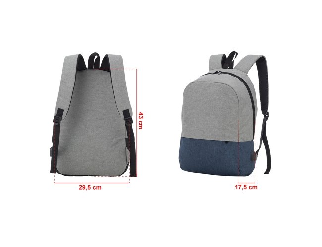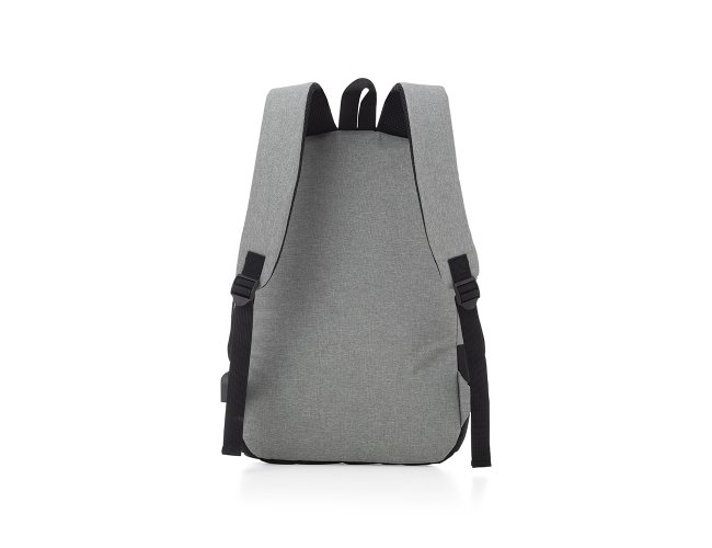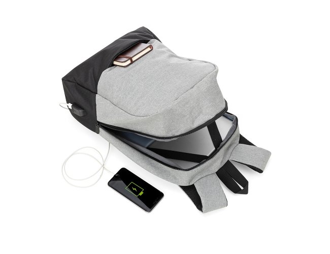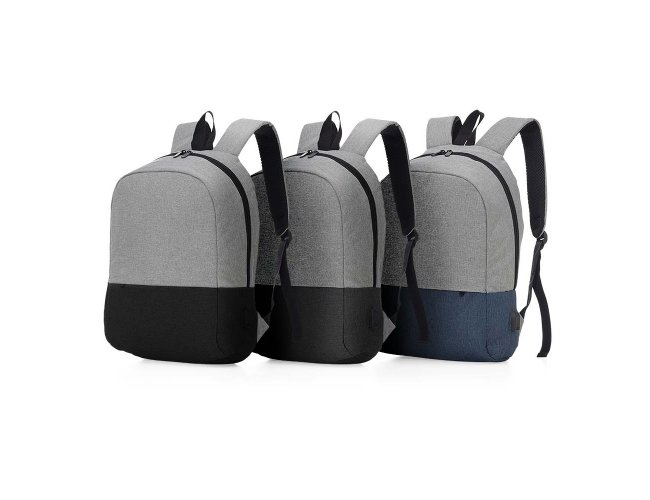 Mochila confeccionada em Poliéster com capacidade para 22 litros. Contém bolso frontal com zíper, alça de mão em nylon, Porta USB lateral, e alças para as costas ajustáveis com revestimento antitranspirante. Possui bolso interno para notebook até 17 polegadas.