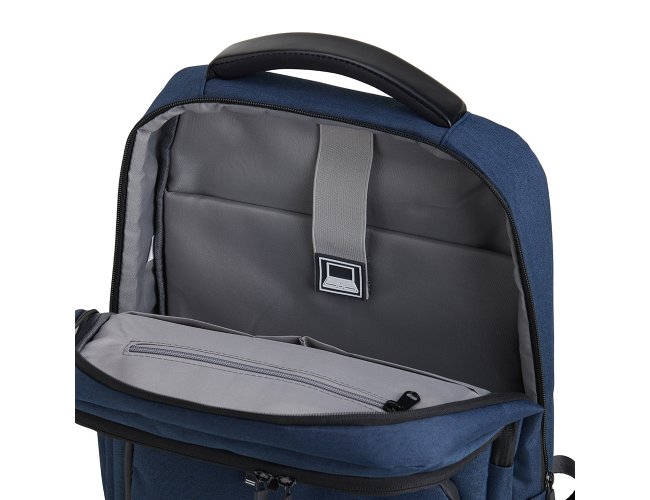 Mochila de Poliéster 23 litros com detalhes em couro sintético. A mochila possui 4 compartimentos, sendo o principal com bolso para notebook 15,6 polegadas. Contém divisórias internas para acessórios, bolso lateral, alça para engate em malas de viagem e suporte externo USB.