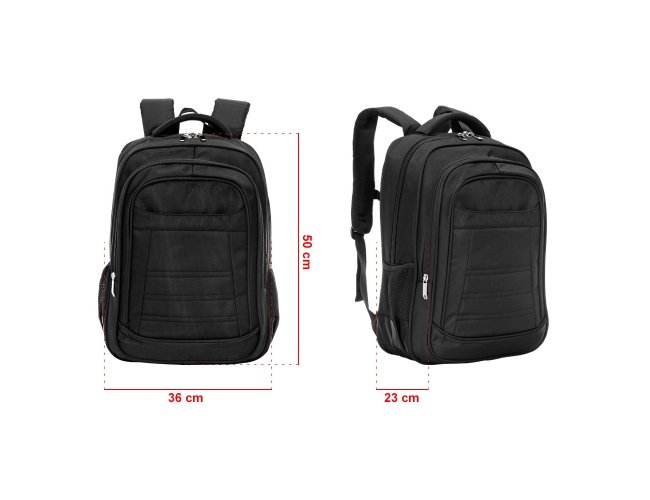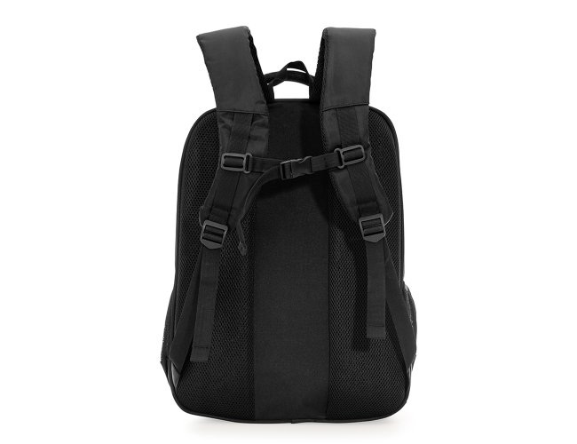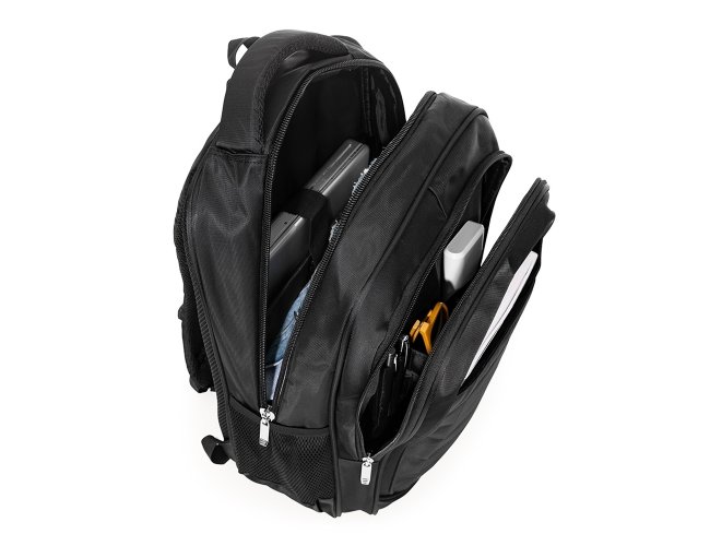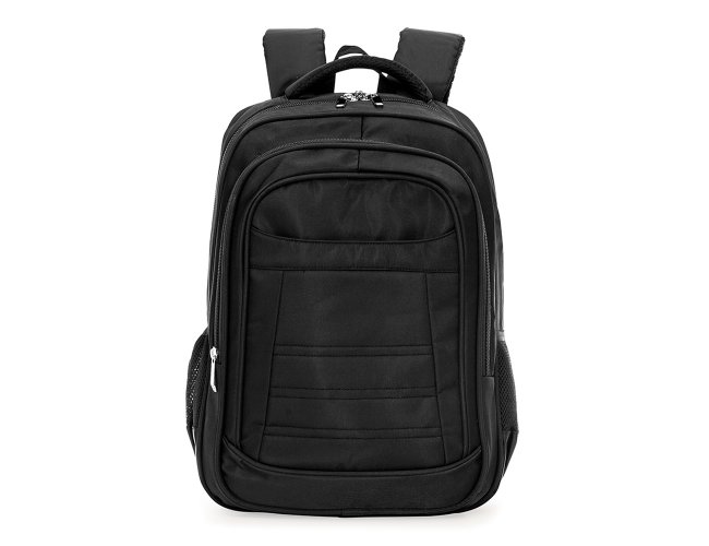 Mochila de poliéster 27 litros com três compartimentos, sendo o principal com bolso para notebook 15,6. Com divisórias internas para acessórios, a mochila possui bolsos laterais em malha, alça de compensação, duas alças de mãos e área costada com revestimento espumado.