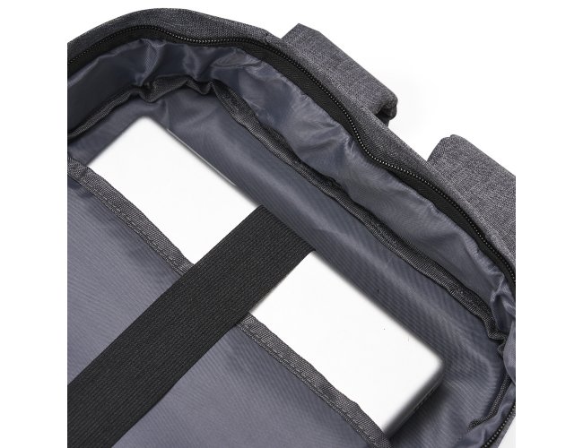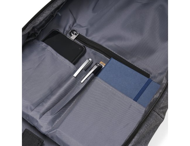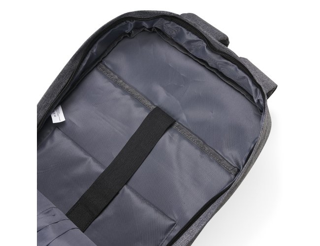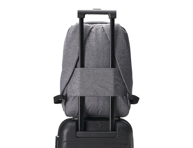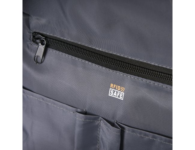 Mochila confeccionada em poliéster com compartimento para notebook até 15,6 polegadas. Contém uma divisória com bloqueador RFID e alça para encaixe em malas de viagem.