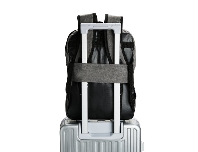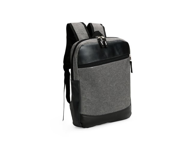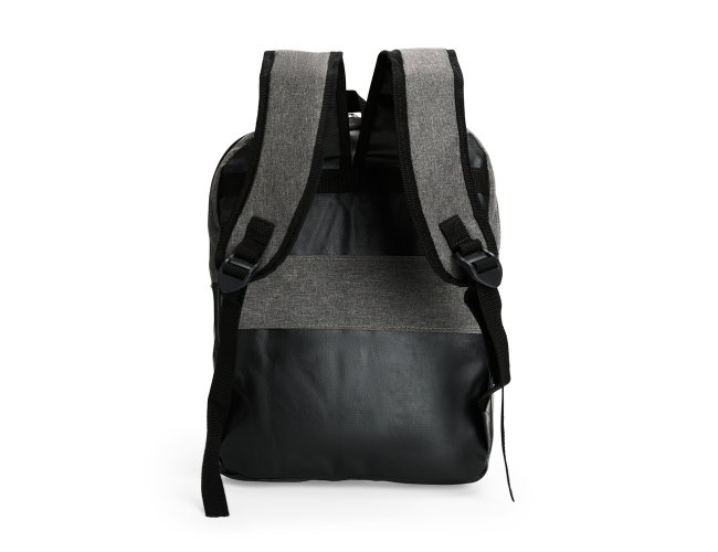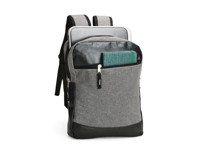 Mochila confeccionada em Poliéster PVC mescla com detalhes em couro sintético e capacidade de até 11 litros. Apresenta divisória interna em tecido telado respirável, ideal para notebooks de até 14 polegadas. Possui compartimento frontal com fechamento em zíper, duas alças para as costas, uma alça de mão e engate posterior para malas de viagem.