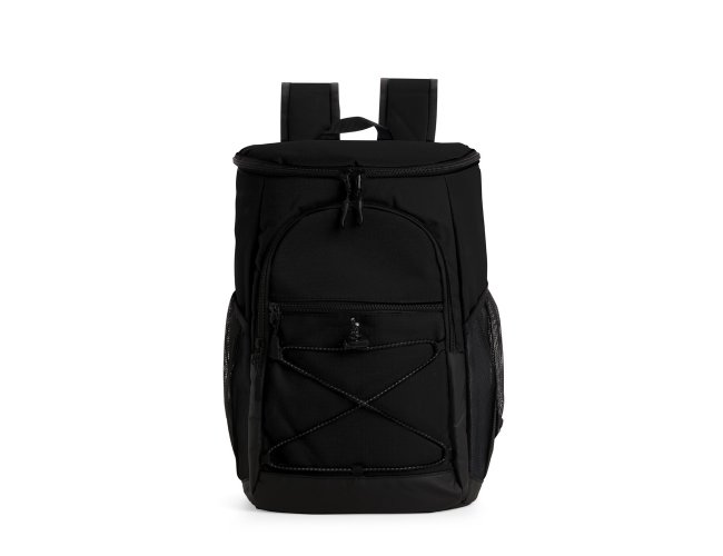 Mochila térmica confeccionada em poliéster impermeável com detalhes em couro sintético e capacidade máxima de 13 litros, distribuída em dois compartimentos revestidos em PEVA: um interno antivazamento e outro, menor, localizado na parte externa. Possui ainda três bolsos externos, incluindo dois em tela de nylon com elástico e um com fechamento em zíper e cordão de elástico ajustável, além de alças e painel traseiro revestidos em espuma respirável.