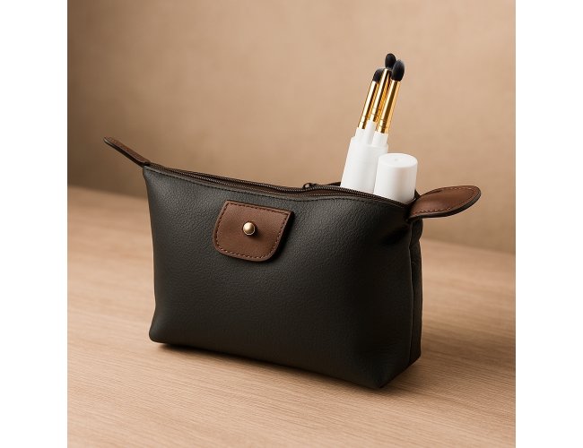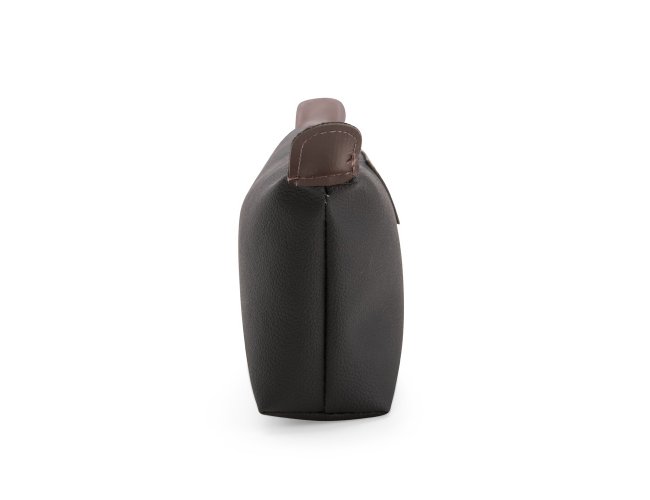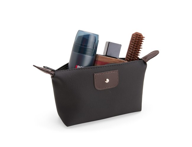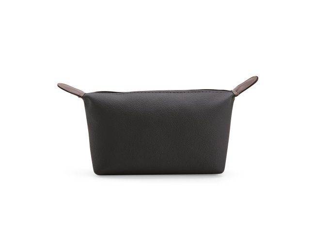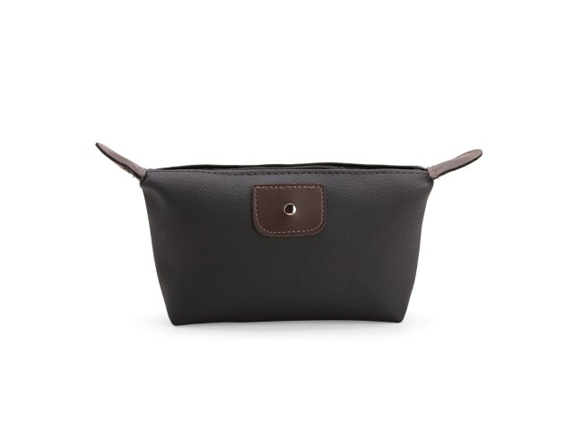 Nécessaire em couro sintético impermeável e fechamento em zíper e detalhe frontal metálico.