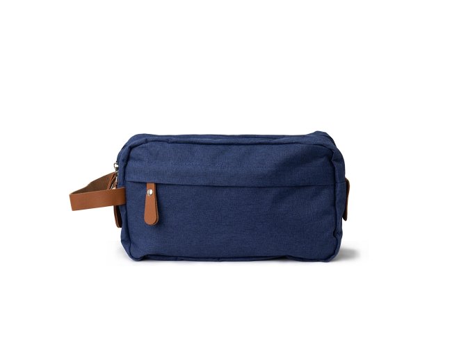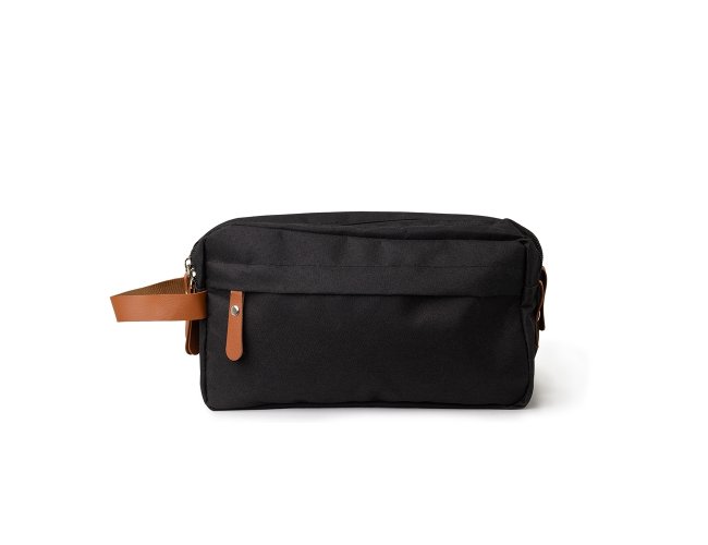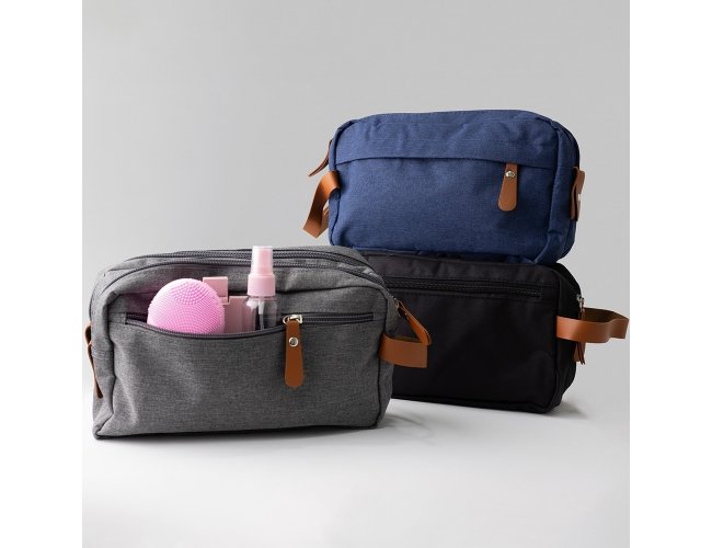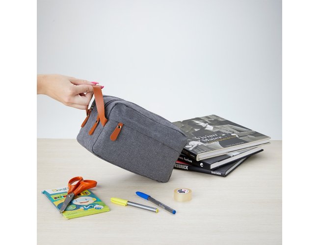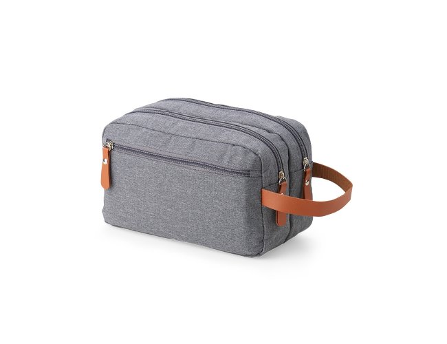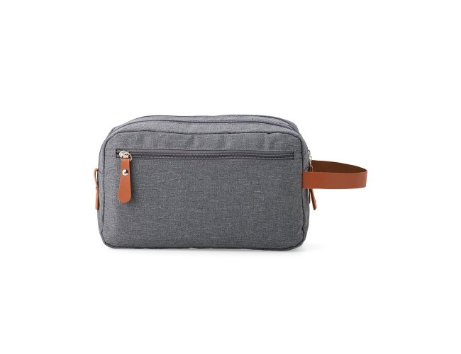 Nécessaire confeccionada em poliéster, com detalhes em couro sintético. Possui três compartimentos com zíper. Na parte interna, contém 5 bolsos, sendo dois de tela, e alça para transporte.