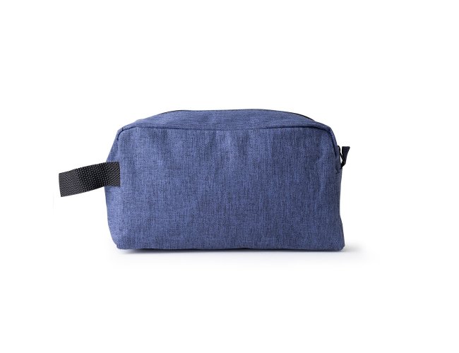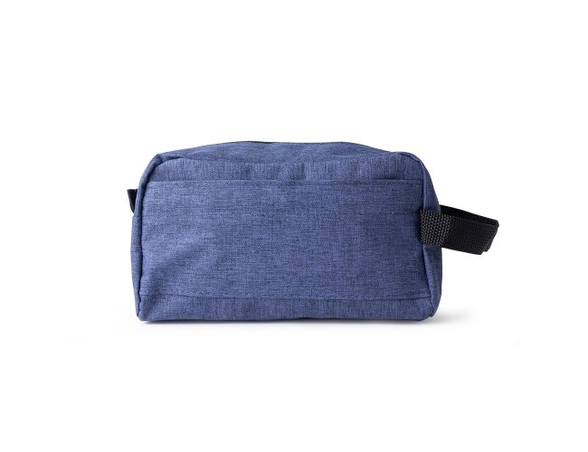 Necessaire de nylon com alça lateral. Possui compartimento principal superior e outro frontal.
