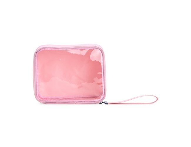 Este nécessaire em formato compacto é feito em nylon e possui viseira de plástico transparente. Além disso, possui fechamento em zíper e alça presa ao puxador feita em nylon.