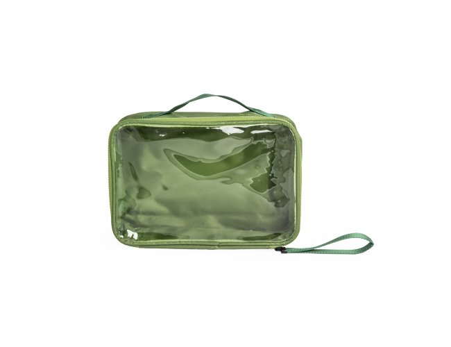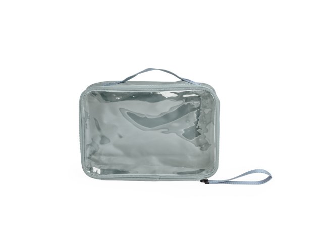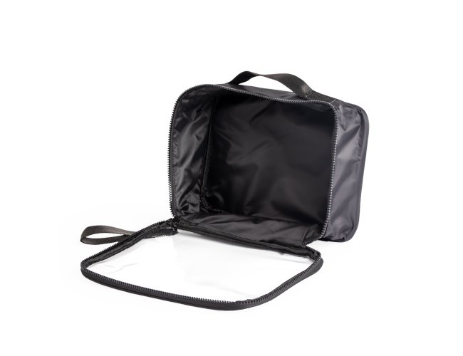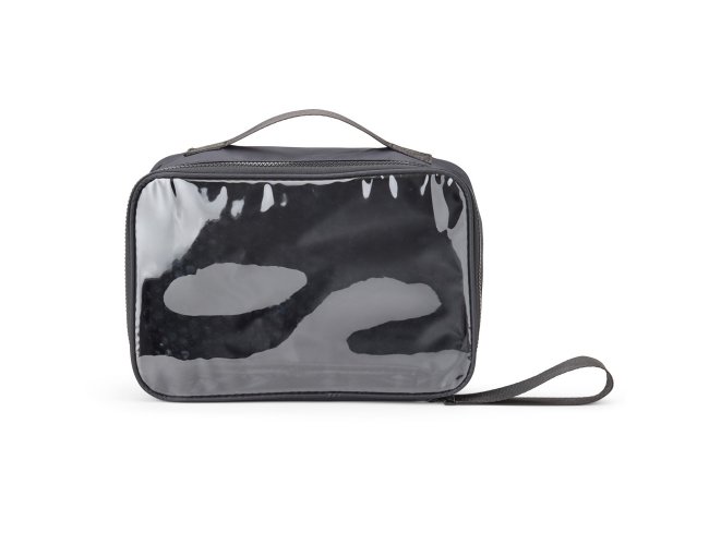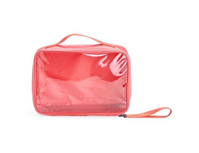 Nécessaire confeccionada em nylon, com frente em visor transparente, fechamento por zíper e alça superior. Inclui também uma alça de transporte em nylon.