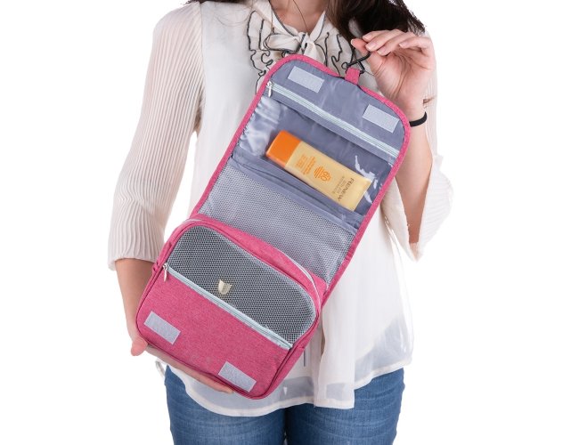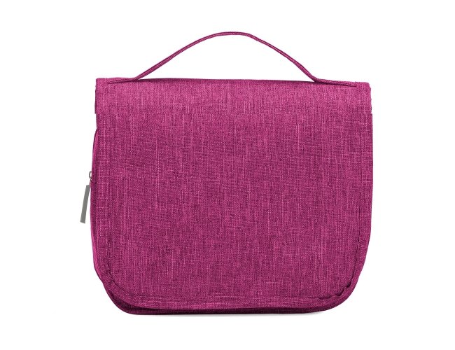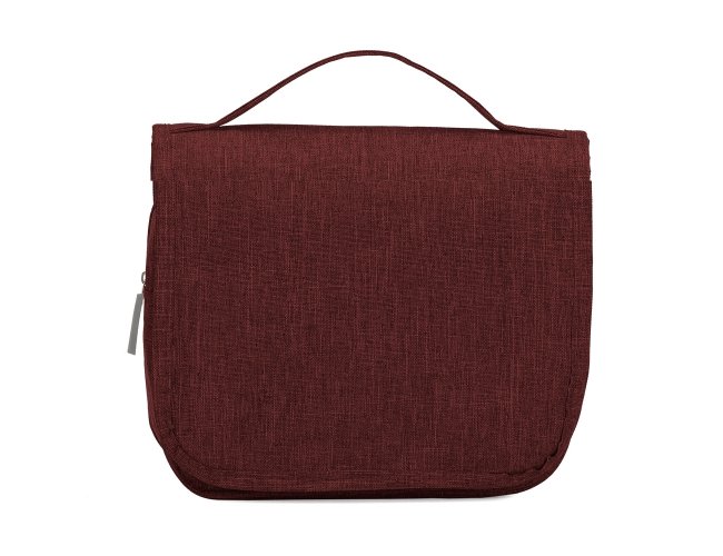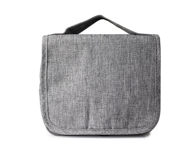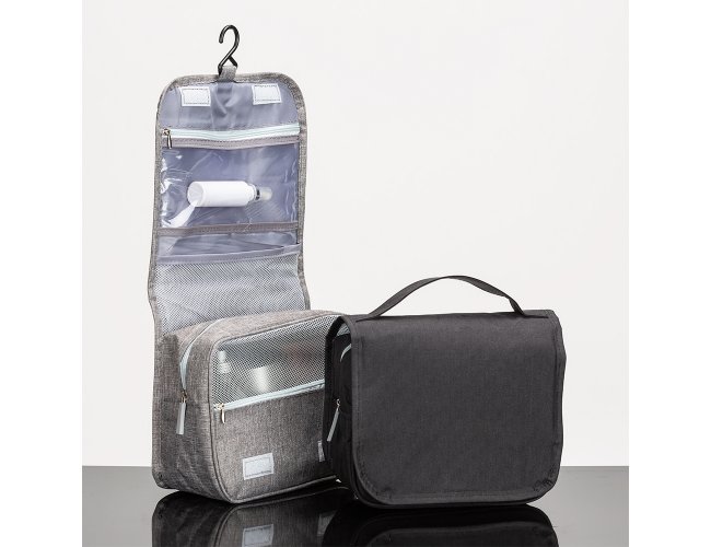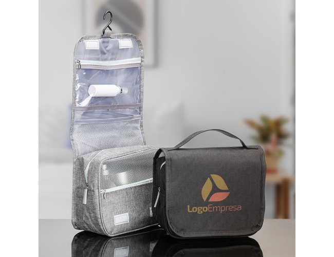 Nécessaire confeccionado em Nylon Oxford resiste à água. Possui compartimento principal com visor em tela de nylon e outros dois em formatos distintos: um em PVC com fechamento em zíper e outro em tela respirável de nylon. Conta ainda com gancho plástico para manter a bolsa pendurada enquanto aberta.