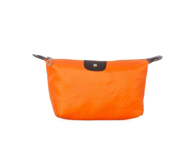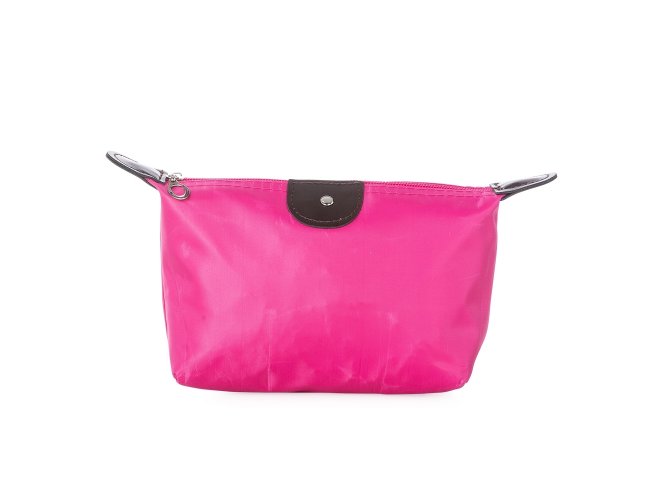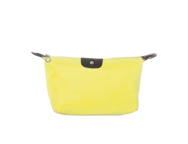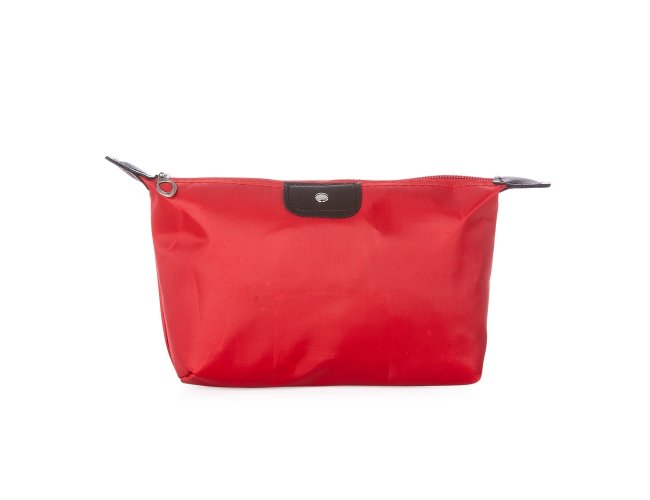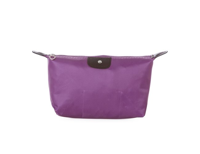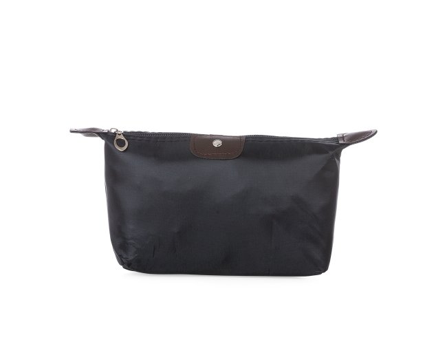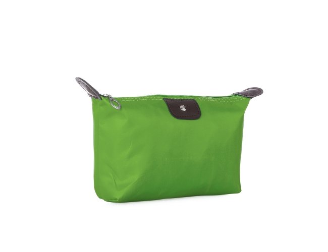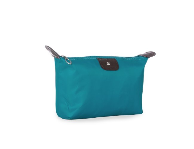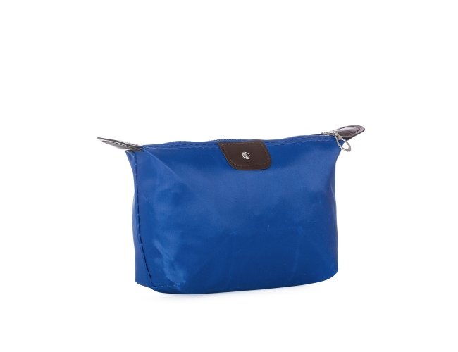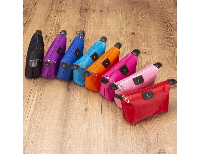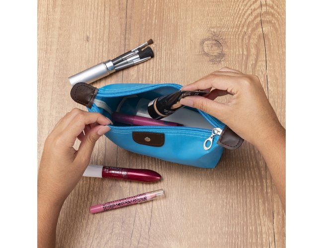 Nécessaire impermeável de poliéster com detalhes em couro sintético e parte interna com revestimento emborrachado, possui um ?botão? no detalhe do couro frontal.