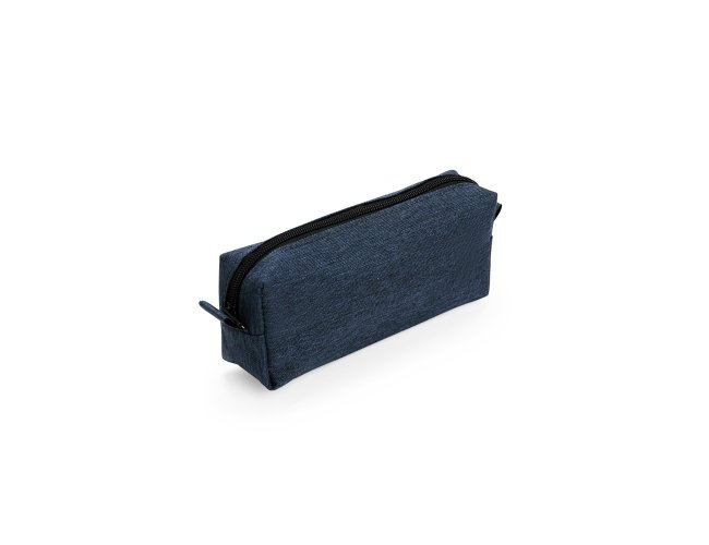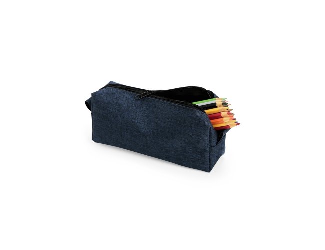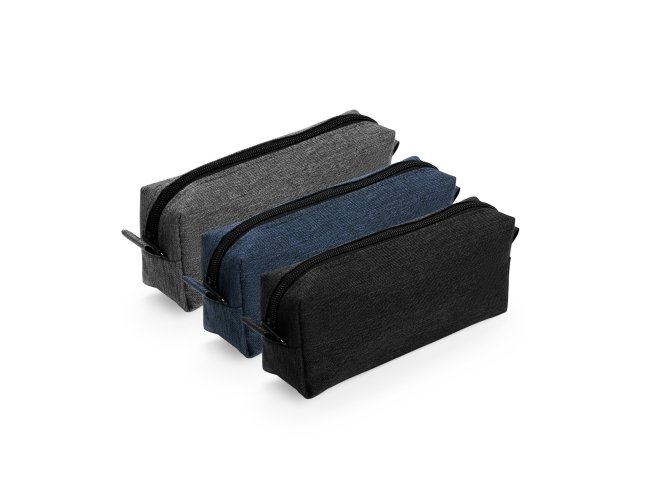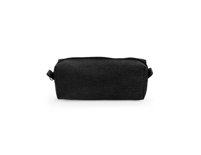 Nécessaire compacto confeccionada em Poliéster PVC mescla resistente à água, com fechamento em zíper e alça pequena para acesso de chaveiro ou gancho.
