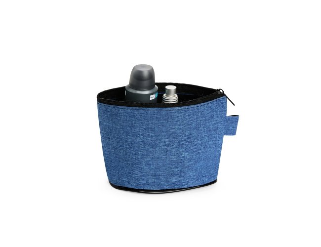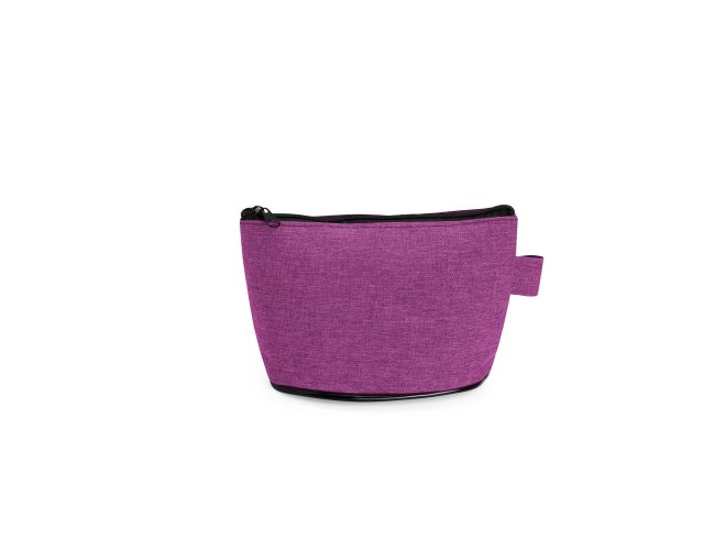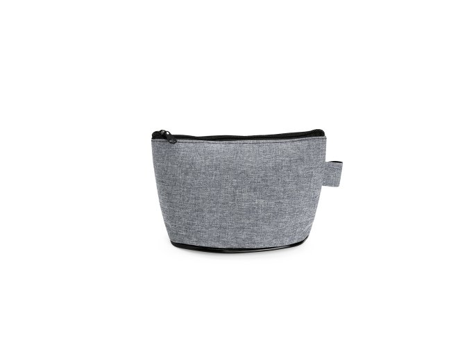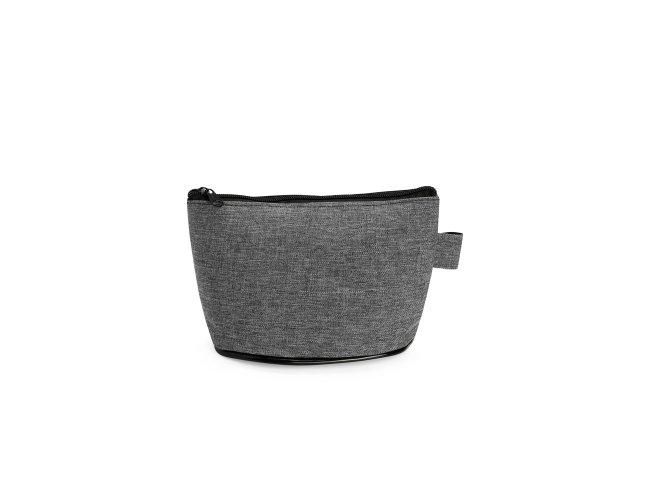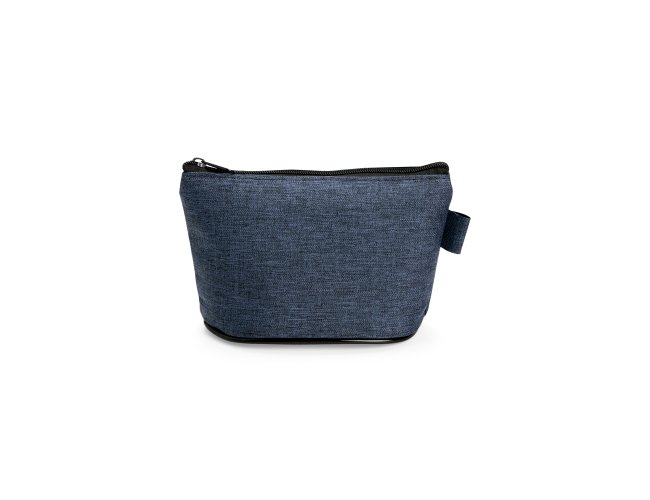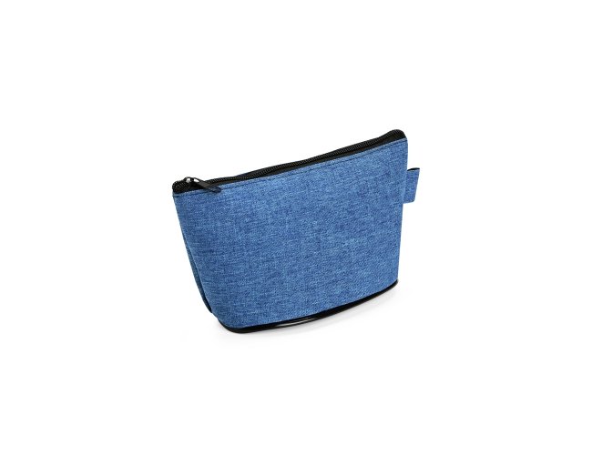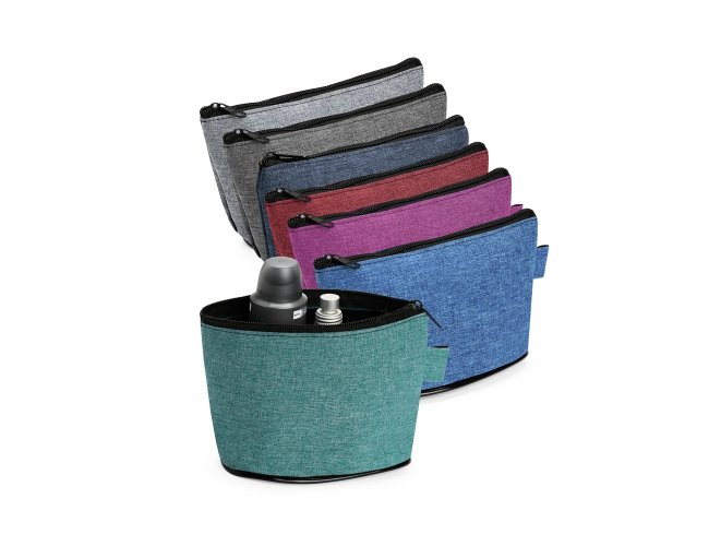Nécessaire resistente à água e confeccionado em poliéster com mescla de PVC. Possui fechamento em zíper e uma pequena alça para fixação de chaveiro ou gancho.