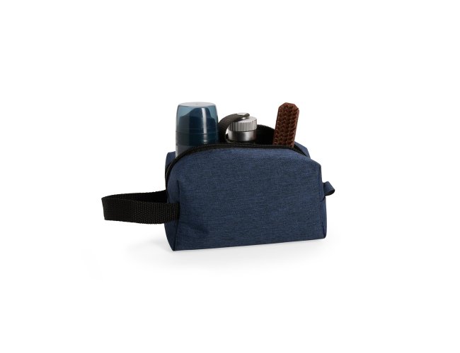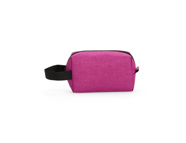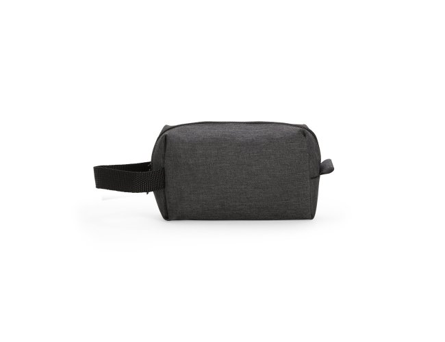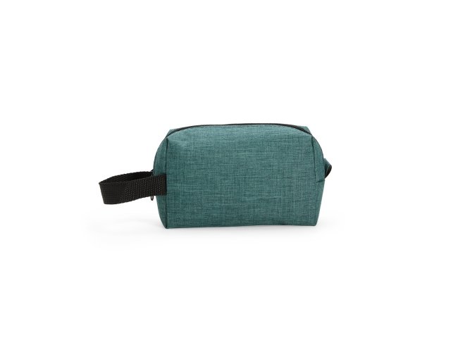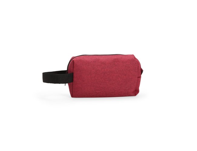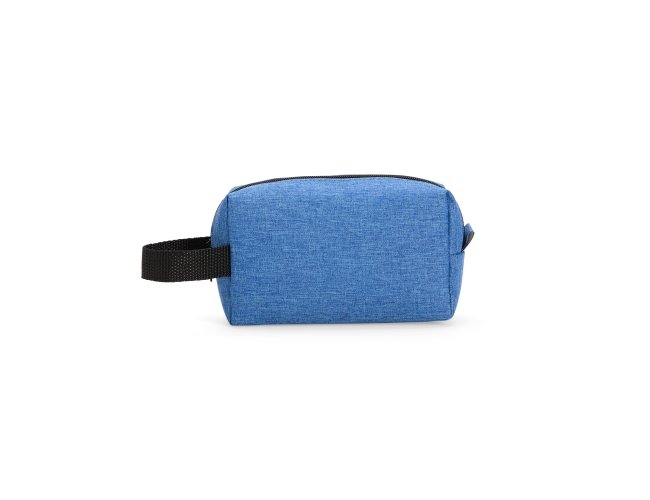 Nécessaire em Poliéster mesclado com PVC resistente à água e fechamento em zíper. Possui alça lateral em nylon para transporte e uma pequena alça para acesso de chaveiro ou gancho.