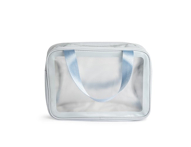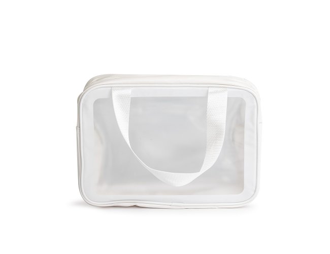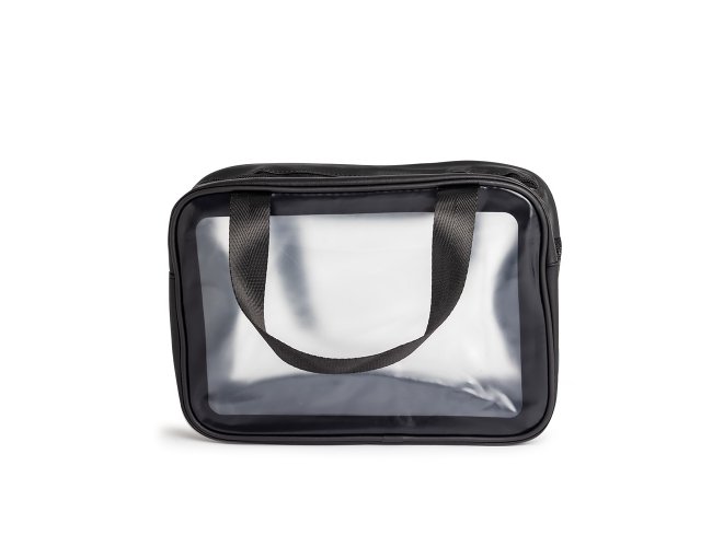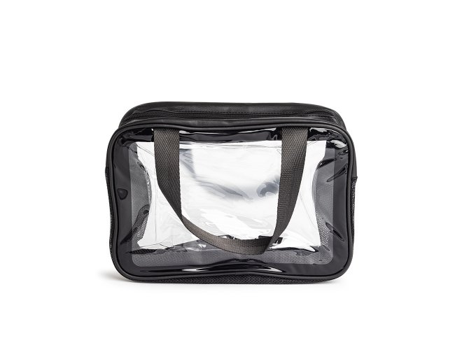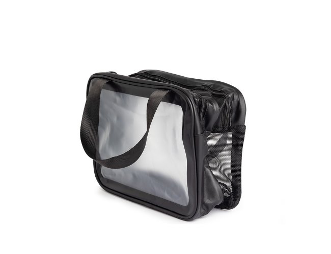 Nécessaire de PVC e PU com duas divisórias, uma delas em malha respirável, e duas alças laterais para facilitar o transporte.