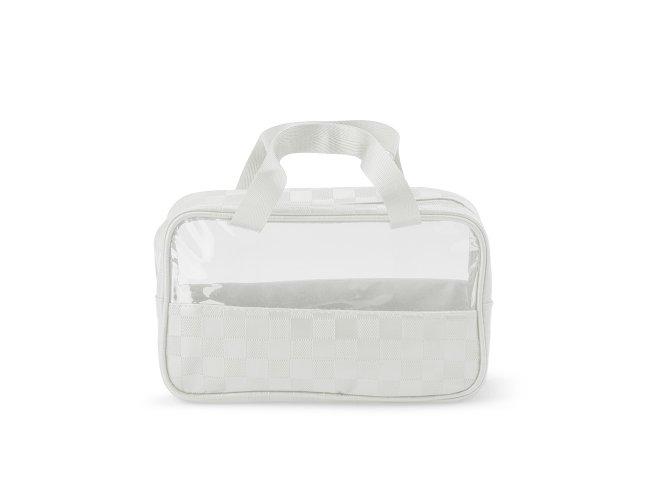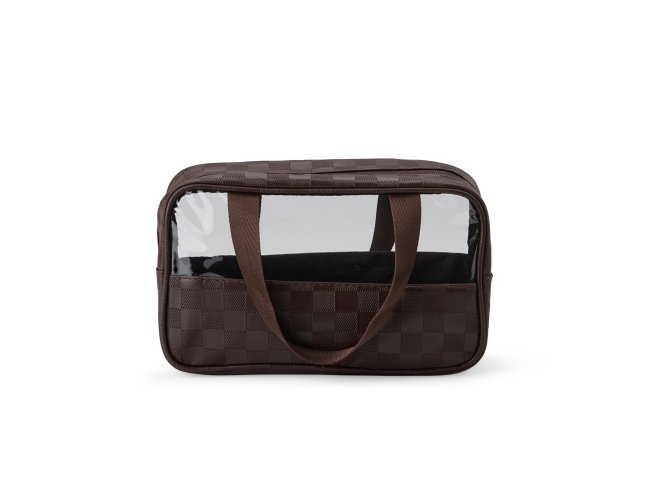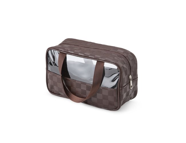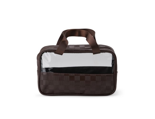 Nécessaire em PVC e couro sintético impermeável em formato xadrez e fechamento em zíper. Possui visor transparente e duas alças de mão em nylon.