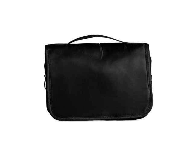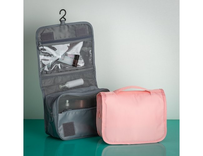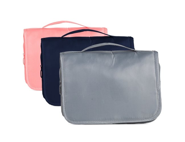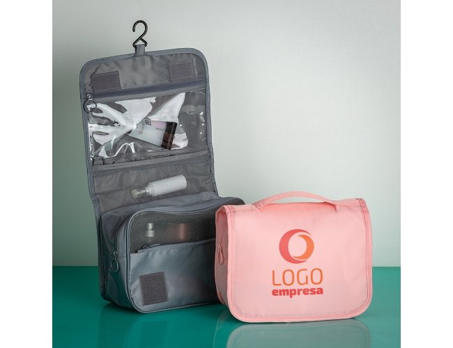 Nécessaire organizadora ?travel?. Tecido Sarja, abertura frontal por velcro e alça superior, parte interna com gancho plástico; bolso interno superior de pvc e bolso de tela superior, ambos de zíper; dois bolsos inferiores de zíper, sendo o primeiro com detalhe superior em tela e 3 divisões internas com 3 elásticos para fixação, segundo bolso na parte frontal interna; parte traseira possui um bolso externo. Perfeita para lhe acompanhar em viagens e até mesmo transportar seus itens pessoais do dia a dia com organização e praticidade.