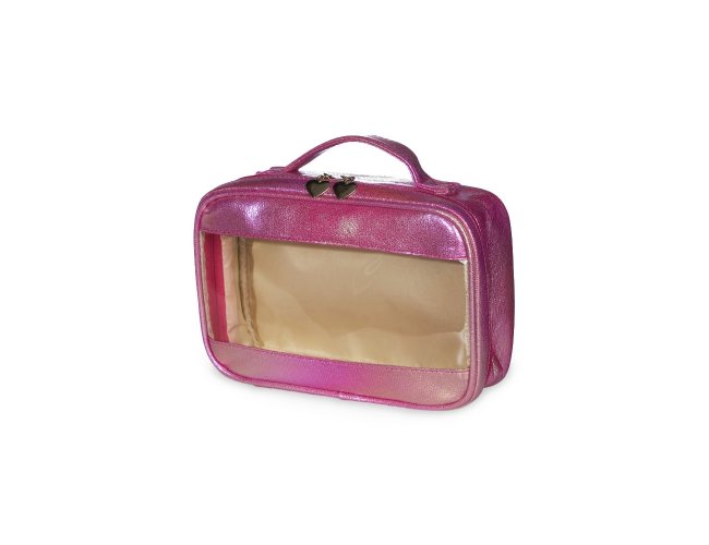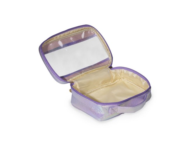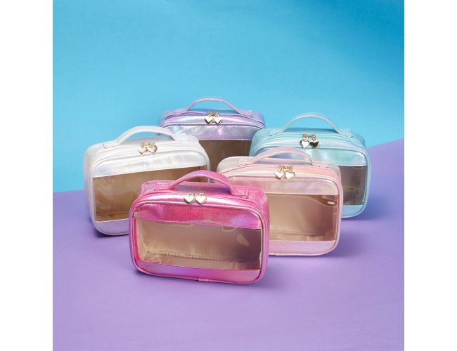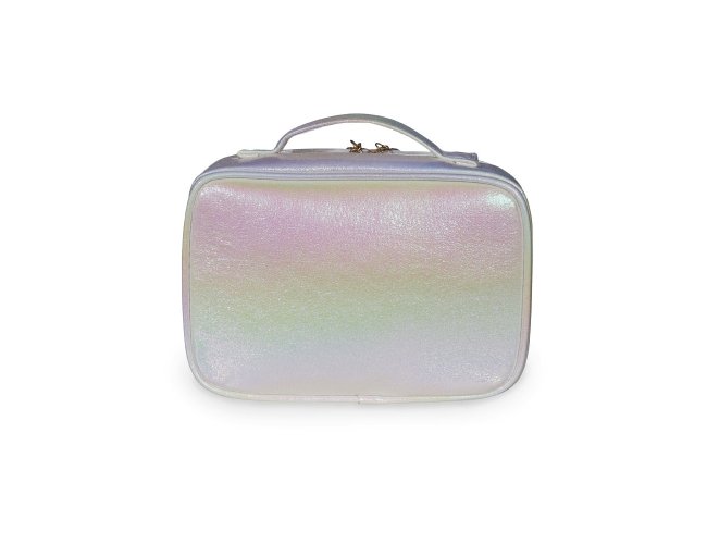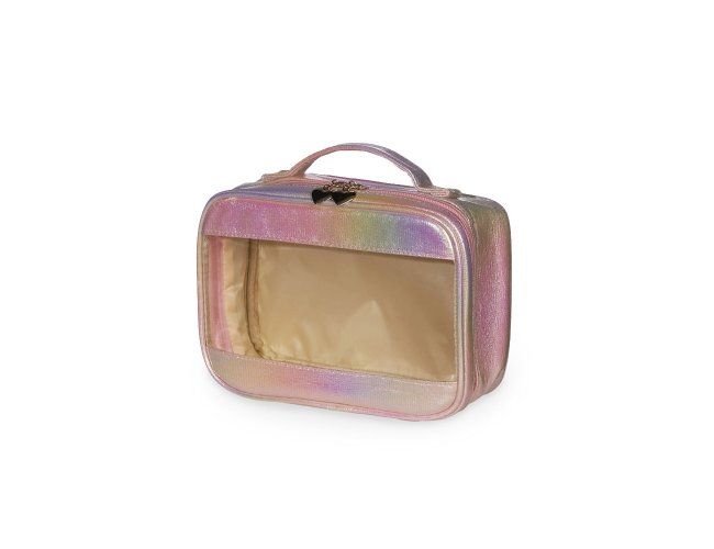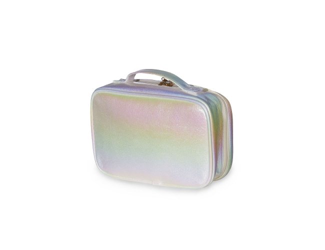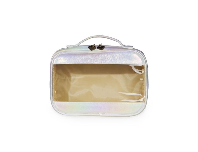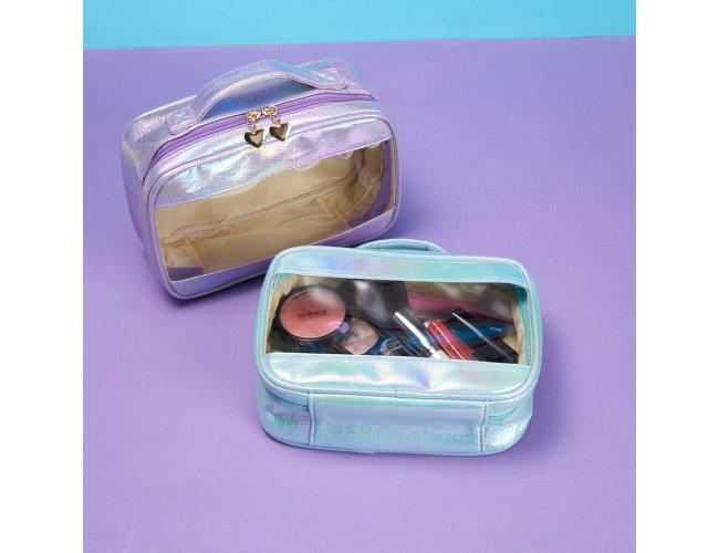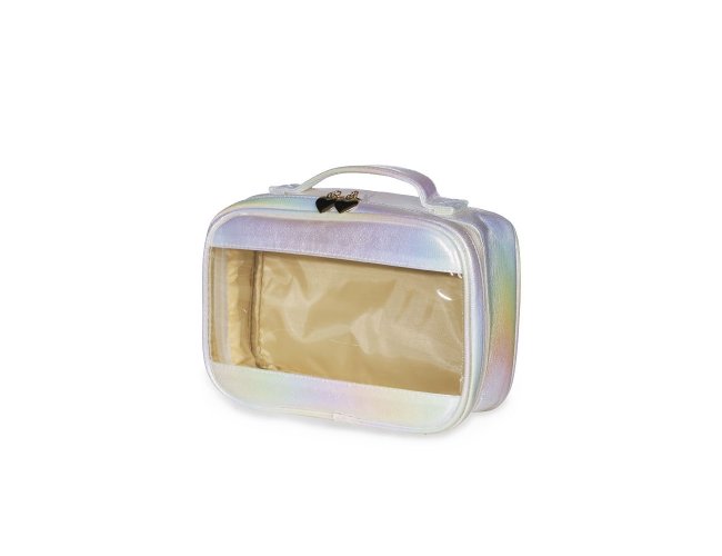 Nécessaire de pvc e tecido sintético com design holográfico, resistente à água.