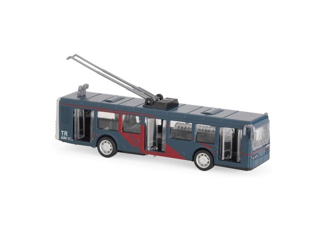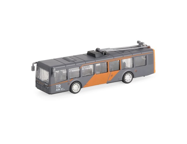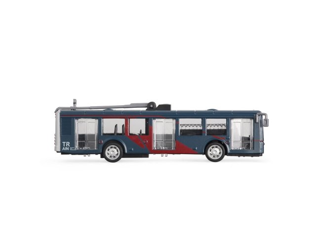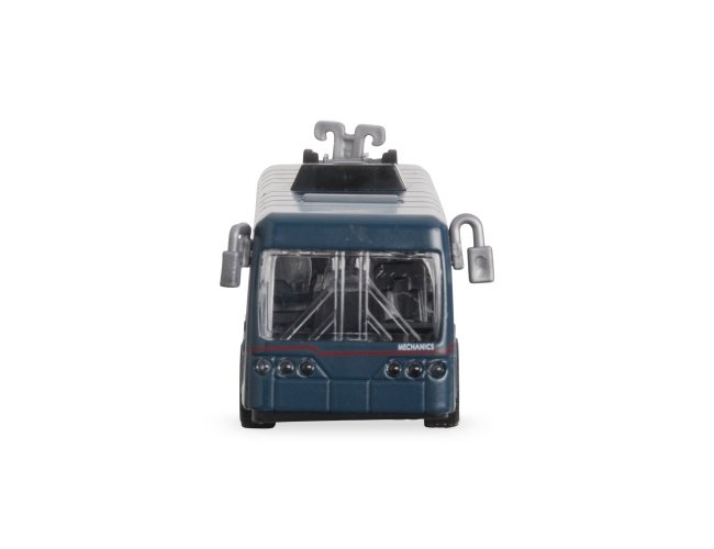 Ônibus em miniatura com estrutura feita em metal e plástico. Conta com pneus emborrachados, mecanismo de fricção nas rodas traseiras e portas com abertura funcional.