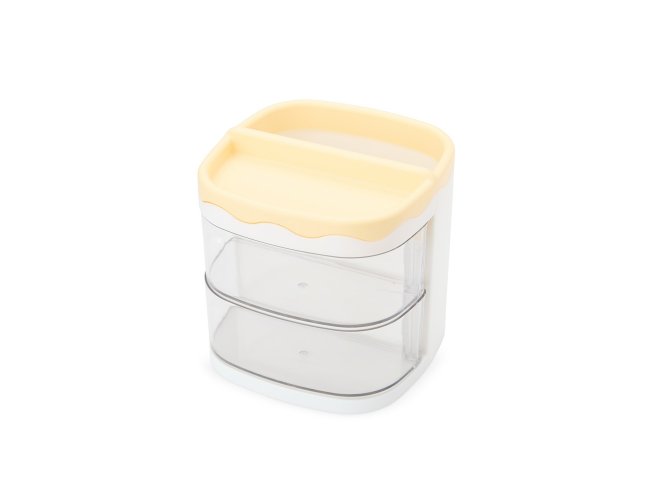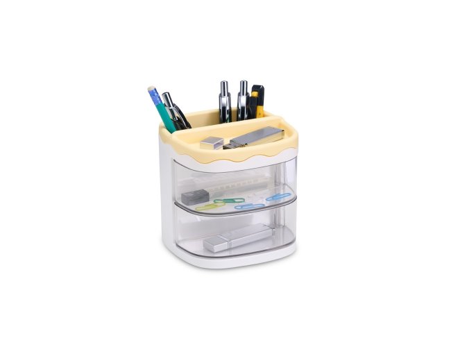 Deixe o espaço da mesa de estudo ou trabalho mais organizado, bonito e prático! Feito em plástico e acrílico, o organizador combina funcionalidade e um toque de beleza. Conta com 2 compartimentos versáteis para lápis, pincéis de maquiagem, canetinhas coloridas ou o que mais desejar, além de um espaço raso para itens como borracha e outros acessórios. Também possui 2 gavetas para objetos diversos, como cola, clipes, mini grampeadores e muito mais. Com este organizador de mesa, é possível usar a criatividade para organizar e decorar.