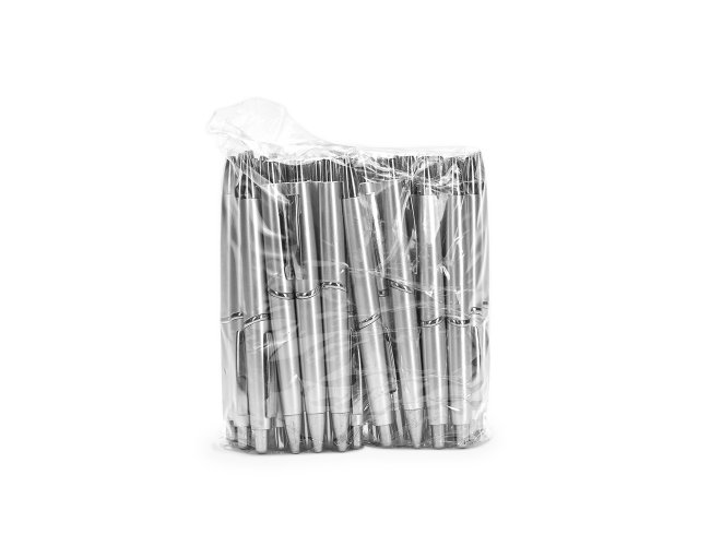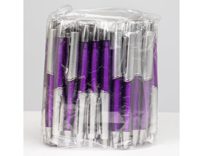 Pacote com 50 peças da caneta plástica com carga esferográfica azul 1.0 mm e acionamento por clique.