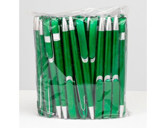 Pacote com 50 peças da Caneta plástica com carga esferográfica azul e acionamento por clique.