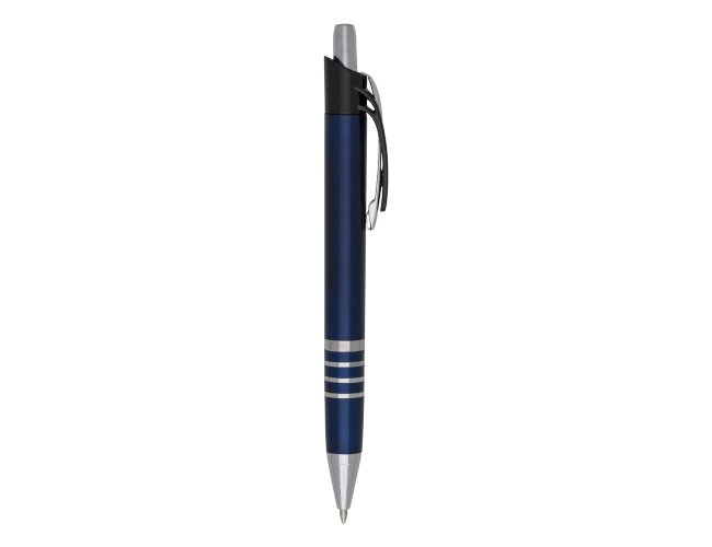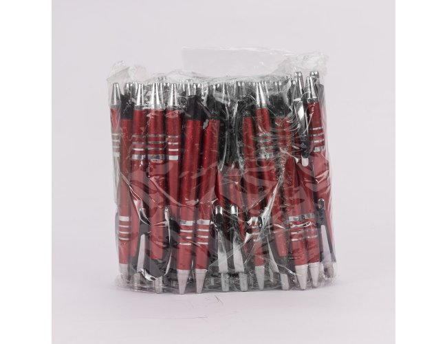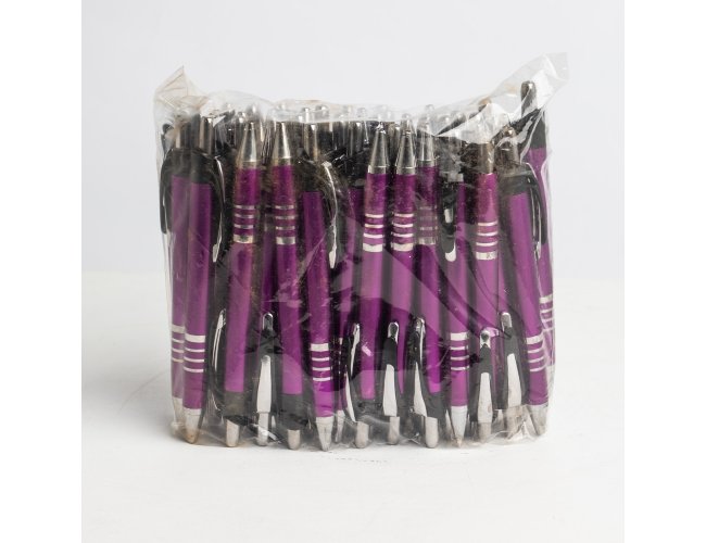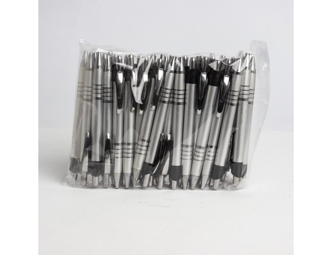 Pacote com 50 peças da caneta plástica com carga esferográfica azul e acionamento por clique.