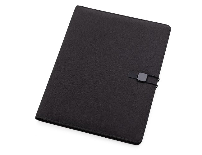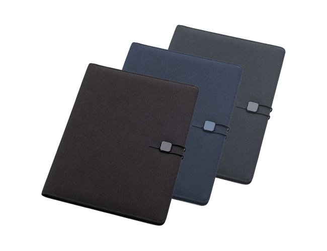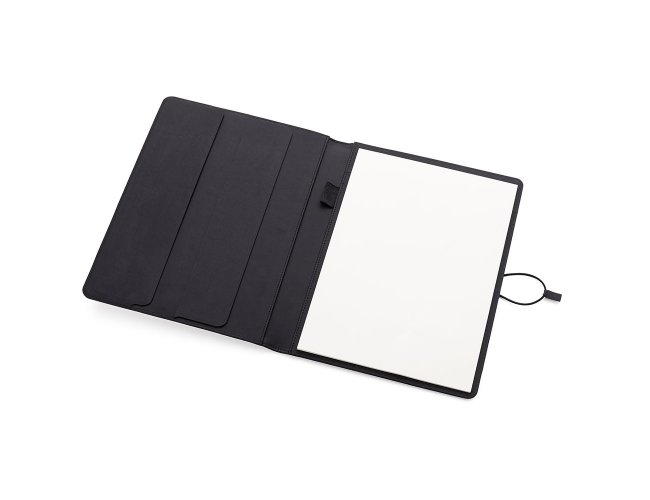 Pasta convenção com capa almofadada em tecido de poliéster. Contém 20 folhas para anotação, porta canetas, porta documentos e porta cartão internos. Possui elástico lateral com detalhe em couro sintético para fechamento da pasta.