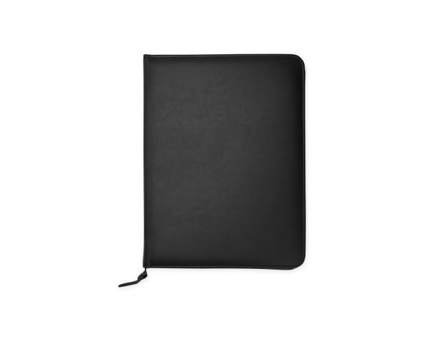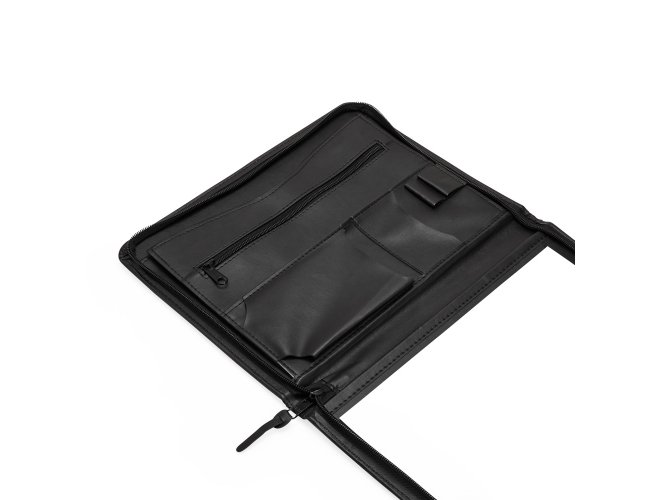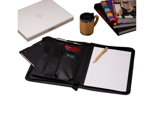 Pasta convenção de couro sintético com zíper, possui um compartimento grande para arquivar documentos, compartimento interno com zíper, uma divisória pequena para documentos, suporte para cartão, e um bolso para celular. Acompanha um bloco A4 com aproximadamente 20 folhas brancas não pautadas.