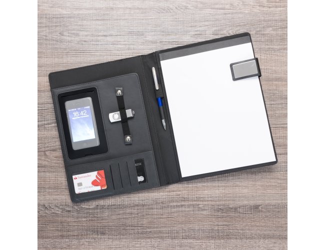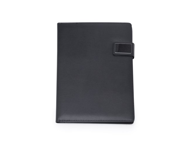 Pasta convenção de couro sintético com trava de imã lateral, possui uma placa de metal na trava ideal para personalização. Possui ?bolso? para arquivar documentos, porta celular com visor fosco, porta cartões com divisórias e visor além de um bolso atrás, suporte elástico para caneta(não acompanha) e bloco A4 com aproximadamente 20 folhas brancas pautadas de verso liso.