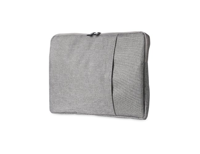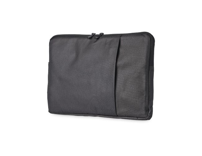 Pasta para notebook 14 em poliéster resistente à água com dois compartimentos, sendo o principal com interior forrado e almofadado.