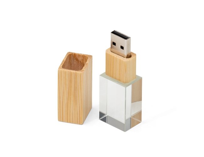 Pen drive de cristal com tampa e detalhe em bambu. Capacidades de 4GB, 8GB e 16GB.