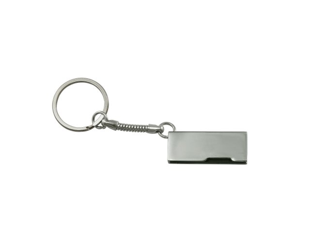Pen drive giratório 4GB de plástico. Parte frontal com detalhe texturizado liso e verso prata espelhado, acompanha corrente metálica.