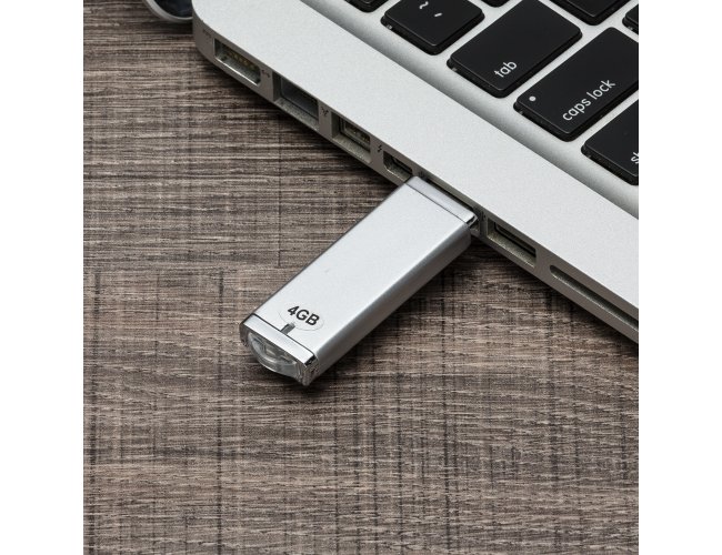 Pen drive Super Talent 4GB/8GB em plástico resistente, corpo cinza com detalhes prata. Possui tampa e ao conectar no USB uma luz irá acender na parte inferior.